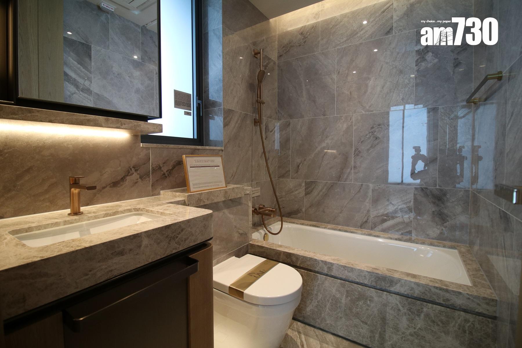 浴室採用明廁設計,配備一系列國際品牌浴室設備,如德國品牌Villeroy & Boch 座廁及洗手盆、德國品牌Bette浴缸,以及意大利品牌Gessi洗手盆水龍頭和花灑套裝。