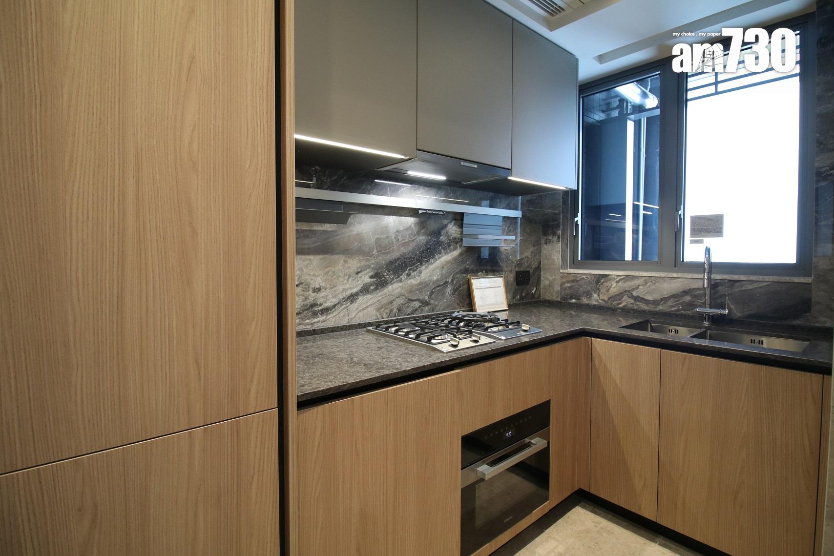 廚房屬梗廚設計,設有L形工作檯面,連接寬敞儲物室及洗手間,可隨時按住戶需要,變成工人房,設計貼心又實用。廚房工作檯面採用亮麗人造石材,牆身採用仿雲石紋理瓷磚鋪面。廚櫃為著重時尚美感的意大利著名品牌Poliform,設有感應燈,並配備多款歐洲知名品牌的電器及爐具,包括德國品牌 Miele 之蒸焗爐、抽油煙機、炒鑊及雙頭氣體煮食爐,以及德國品牌Siemens之嵌入式雪櫃及洗衣乾衣機。