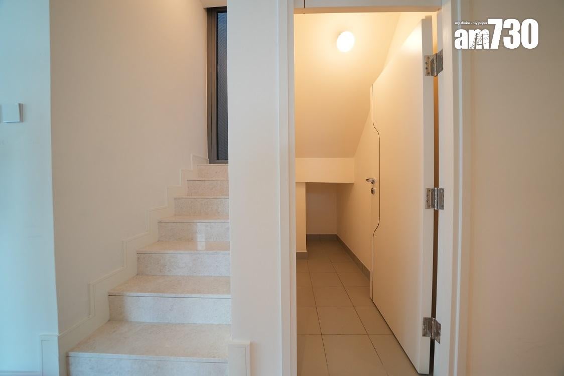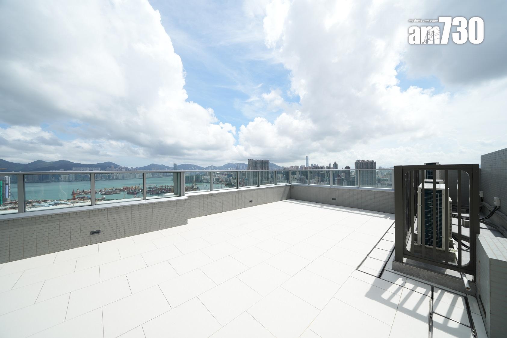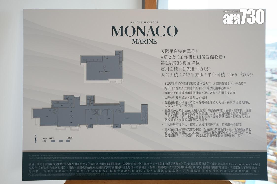 MONACO MARINE另一個現樓示範單位為第1A座38樓A室,屬天際平台特式單位,全盤只設3伙,屬四房雙套連工作間及洗手間大宅,實用面積1,708方呎。客飯廳連接265方呎平台,連內置樓梯通往747方呎私人天台,獨享項目最大的私人天台。