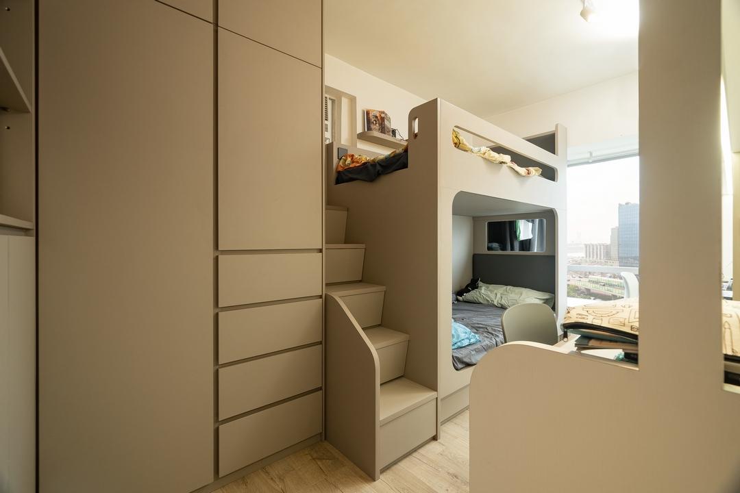 而大概四到八歲的階段,小孩應該已到可以獨自睡覺的階段,可以選用碌架床或者地台床,增加收納的空間,而碌架床亦可以加添樓梯,空間足夠甚至可以增加滑梯,小孩必定喜歡。而為保障安全,兒童床緊記要增添圍欄或者扶手,另外亦避免冷氣機出風位在正對兒童床,以免小孩著涼。