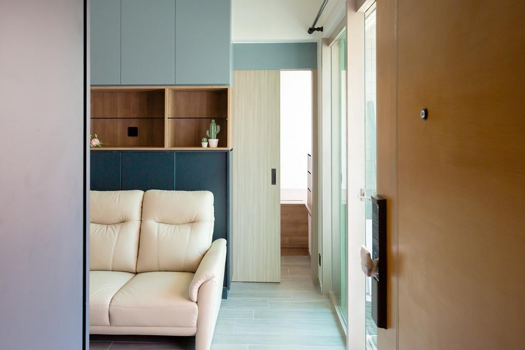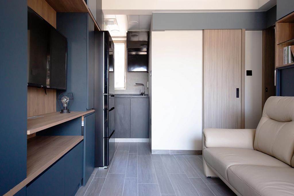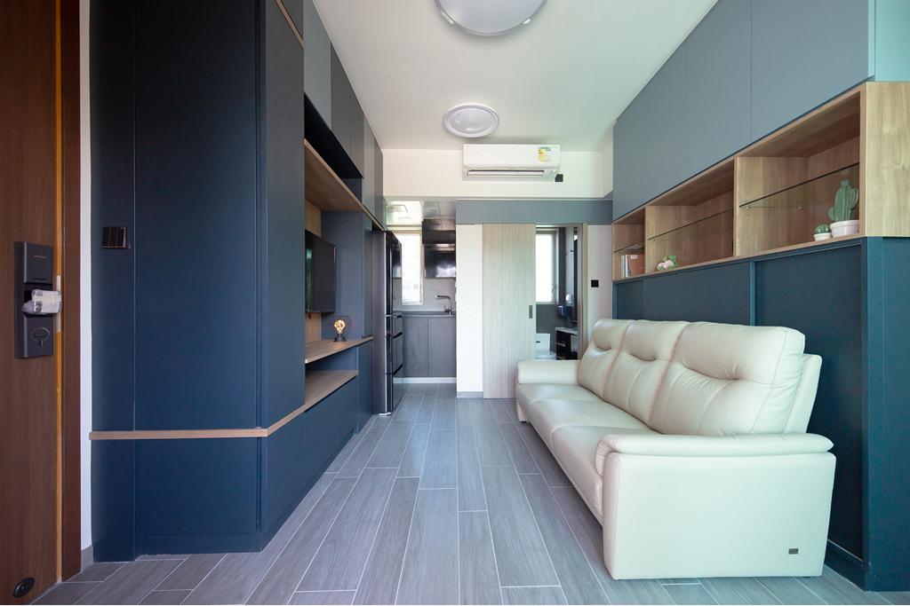 今次介紹的這個位於深水埗區的住宅單位,空間不大,面積不足300平方呎,設計師特意挑選霧藍色較深沉的顏色主色調,客廳的儲物櫃的面色都選用了霧藍色,讓空間添一抹寂靜而又神秘的氣息,配搭木色傢俬及木紋磚亦非常配襯,空間質感大大提升。另外,藍色有穩定情緒的作用,在忙碌的辦公室回到家中,都有治癒人心的效果。