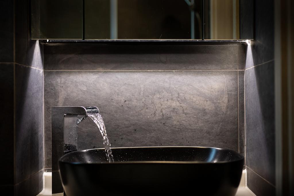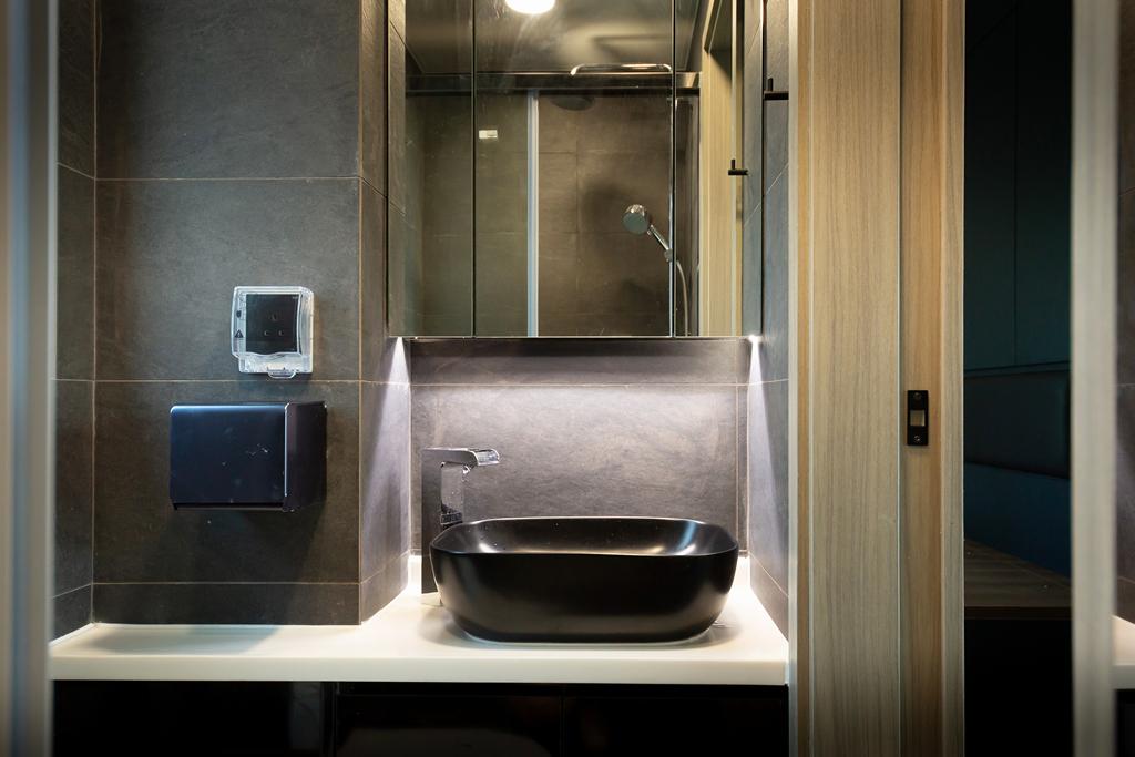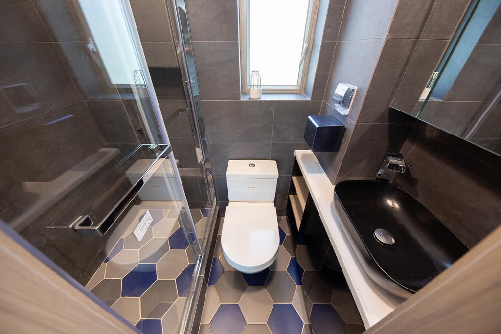 而浴室主要以黑白灰色做配搭,帶出簡潔又時尚的感覺,不過浴室空間不大,僅僅夠做浴室櫃連檯上盆,淋浴的空間亦剛好夠做浴屏,而地板則鋪上六角形磚,營造層次感。