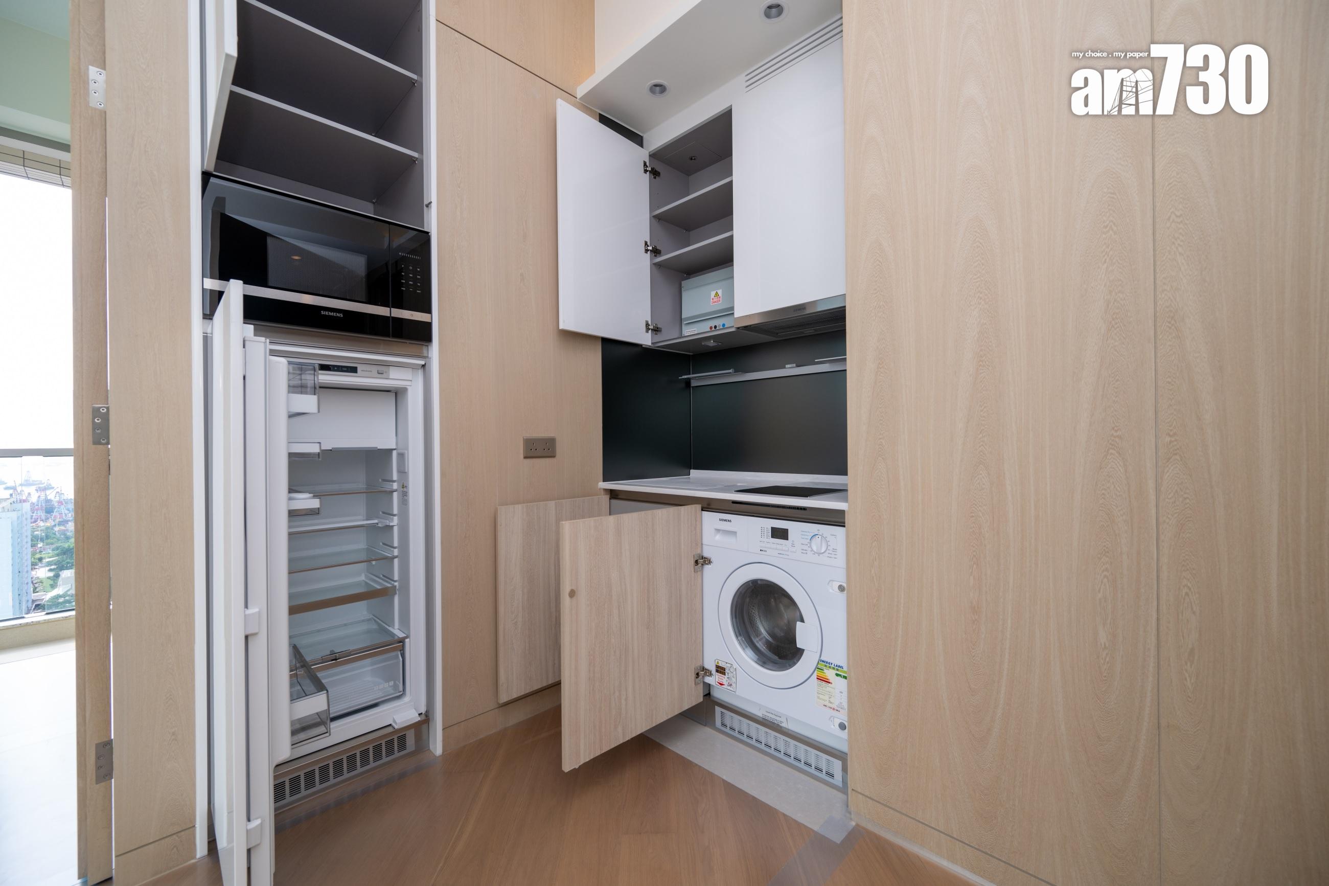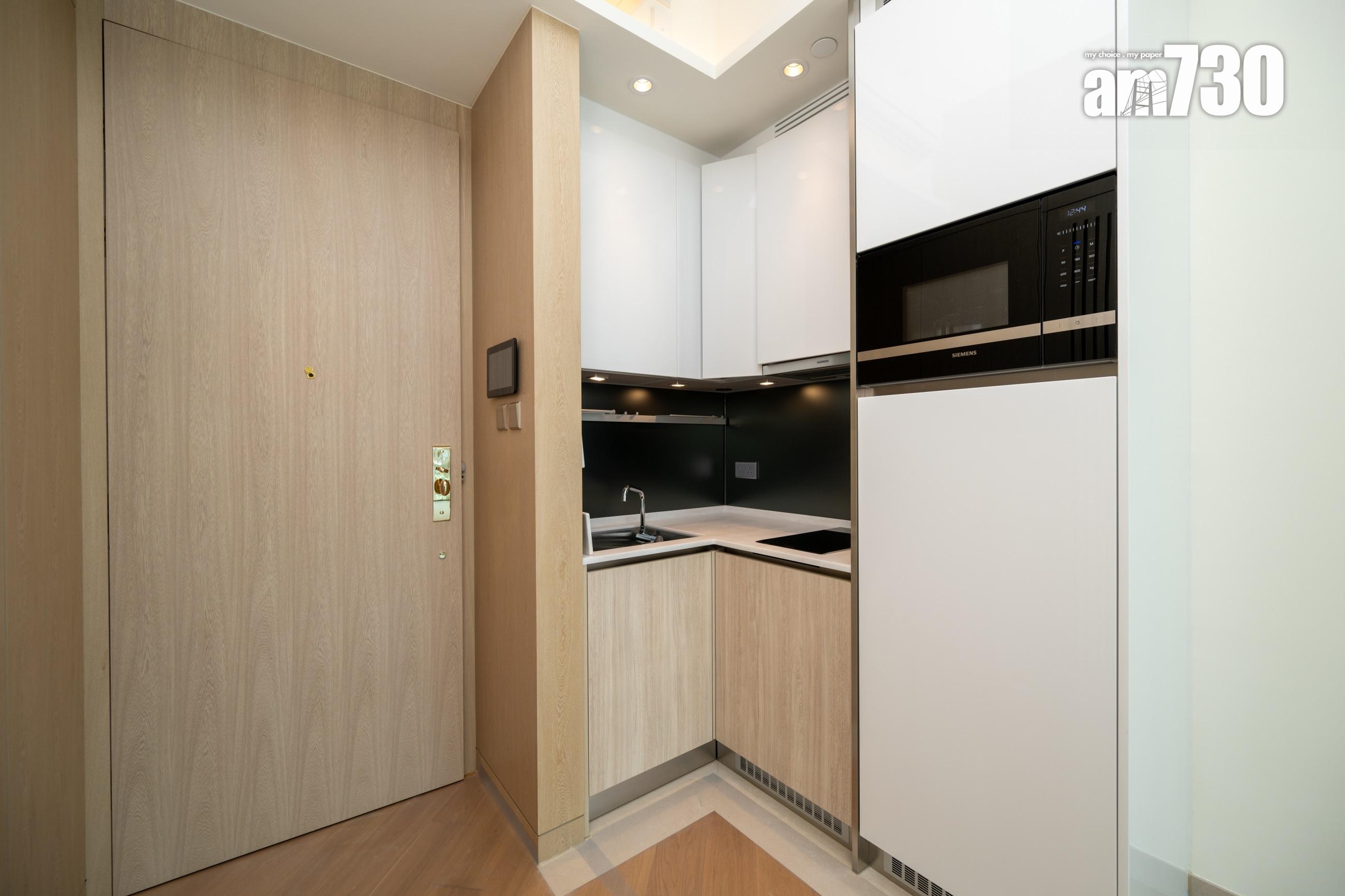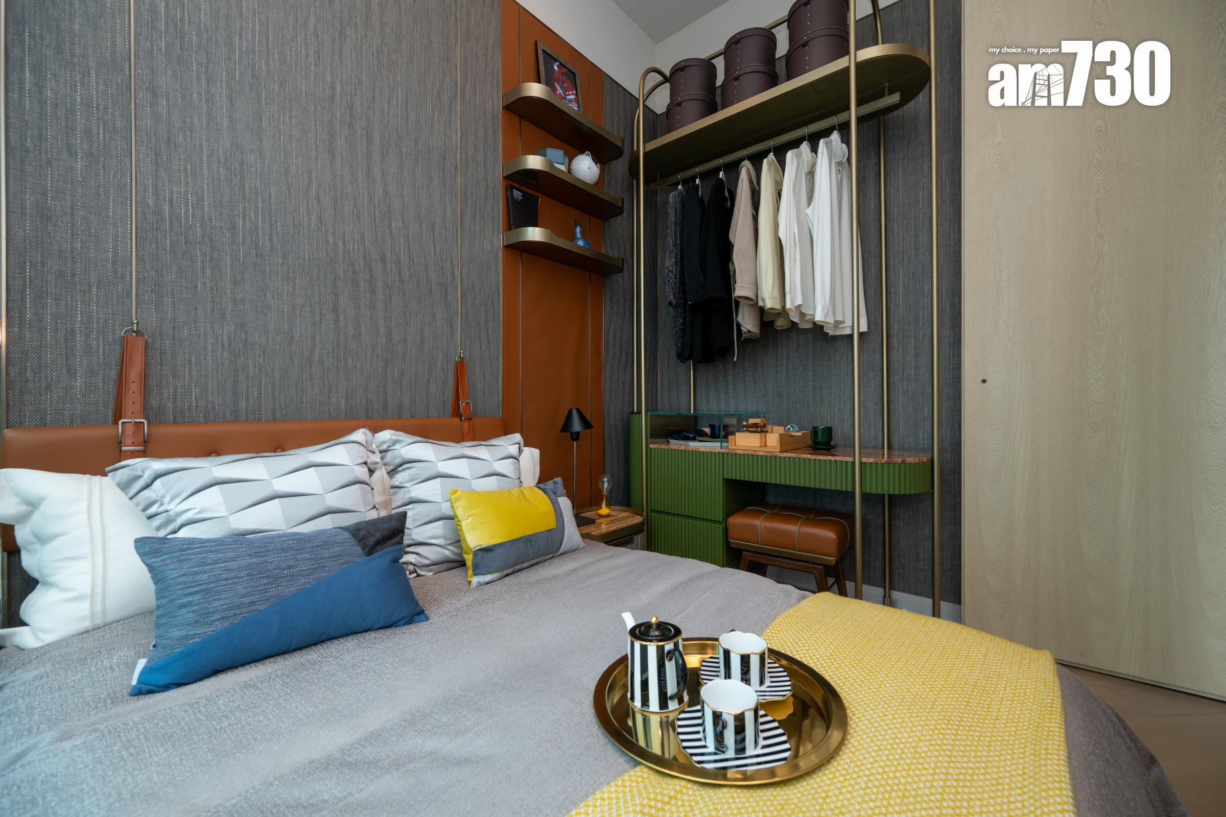 睡房運用柔和中性色調,以深色木紋牆配襯橙褐色皮革及金屬元素,營造舒適且富現代感的休憩空間。睡房預留衣櫃位置,設有訂製開放式衣櫥,令衣櫃下身位置更可擺放一張梳妝檯,連抽屜的組合切合收納需要之餘,暖色系色調的配搭亦散發時尚品味。單位採開放式廚房設計,設備一應俱全,選用德國名牌SIEMENS一系列家電,包括拉趟式抽油煙機、電磁爐、微波爐、雪櫃及洗衣乾衣機,讓住戶享受入廚樂趣。