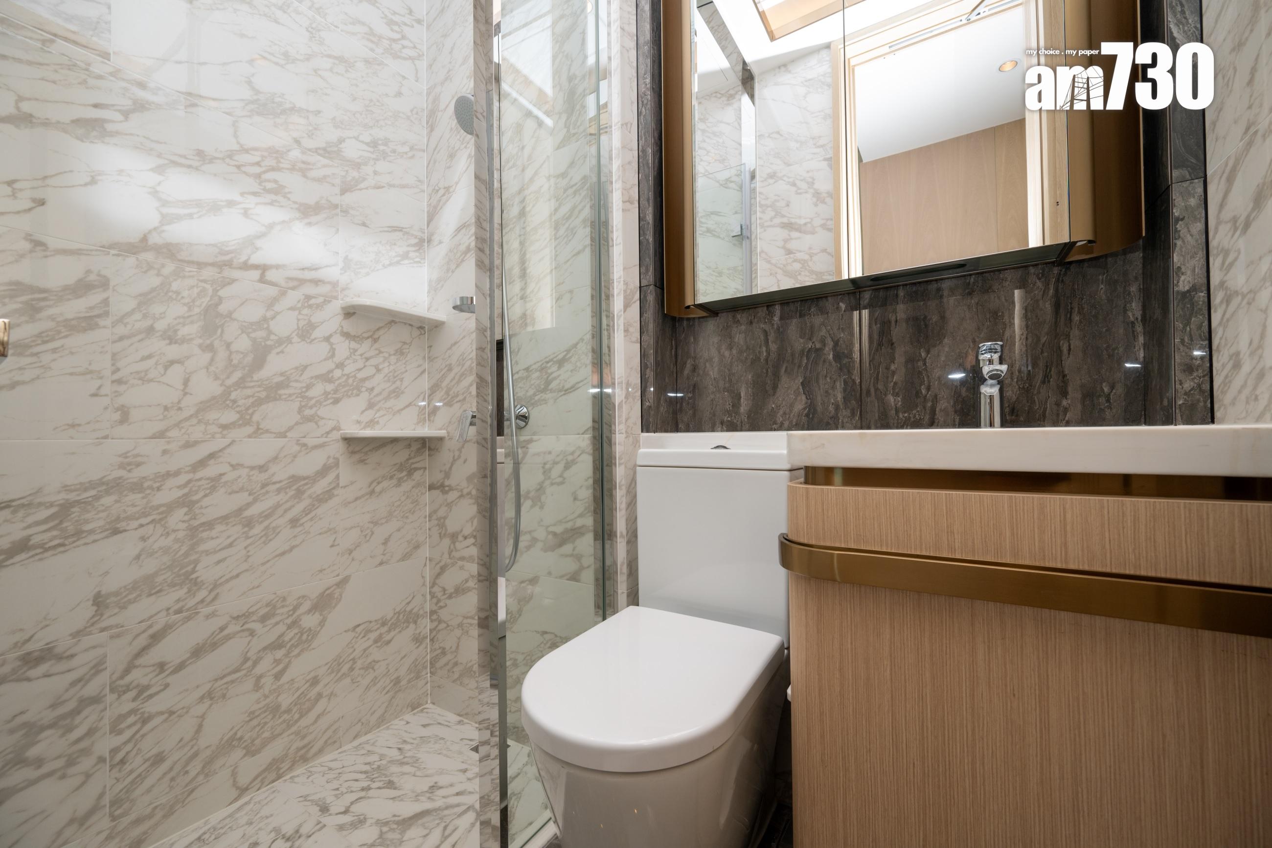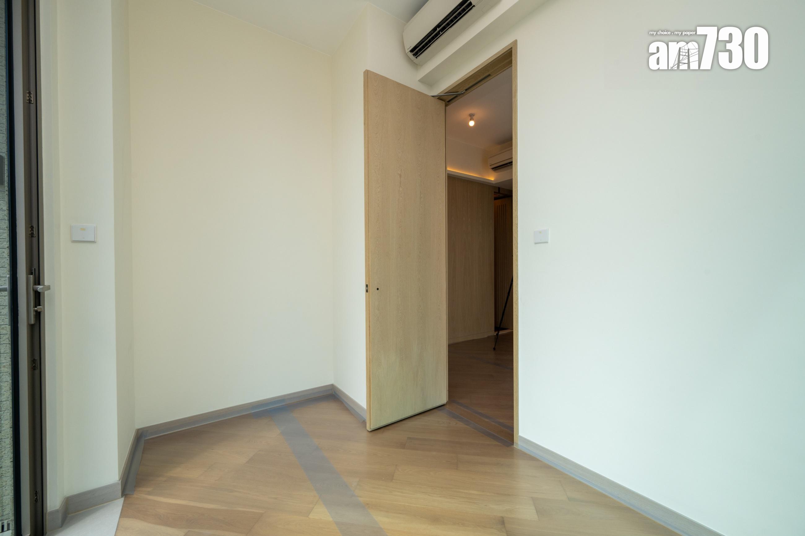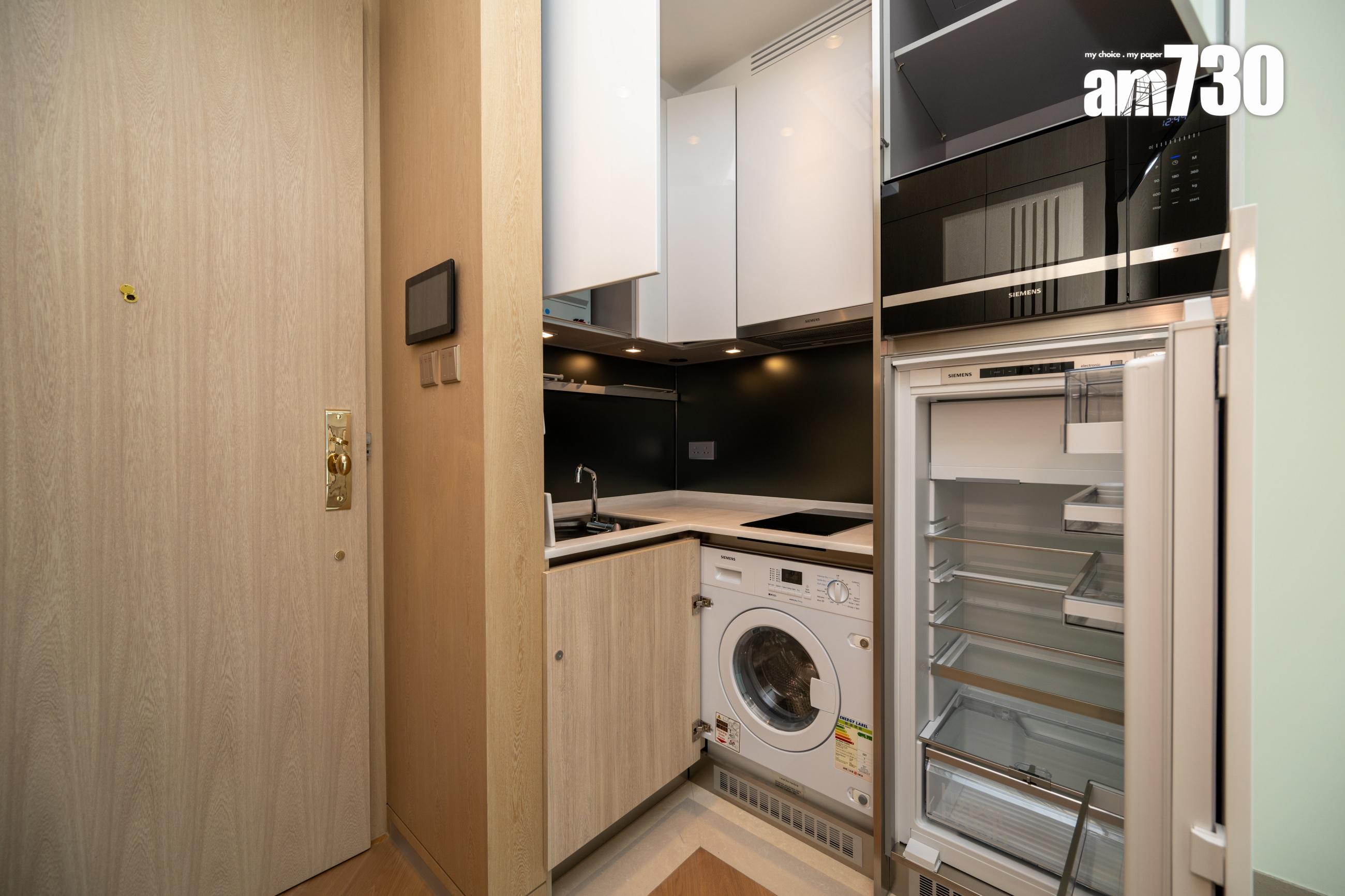 睡房運用柔和中性色調,以深色木紋牆配襯橙褐色皮革及金屬元素,營造舒適且富現代感的休憩空間。睡房預留衣櫃位置,設有訂製開放式衣櫥,令衣櫃下身位置更可擺放一張梳妝檯,連抽屜的組合切合收納需要之餘,暖色系色調的配搭亦散發時尚品味。單位採開放式廚房設計,設備一應俱全,選用德國名牌SIEMENS一系列家電,包括拉趟式抽油煙機、電磁爐、微波爐、雪櫃及洗衣乾衣機,讓住戶享受入廚樂趣。