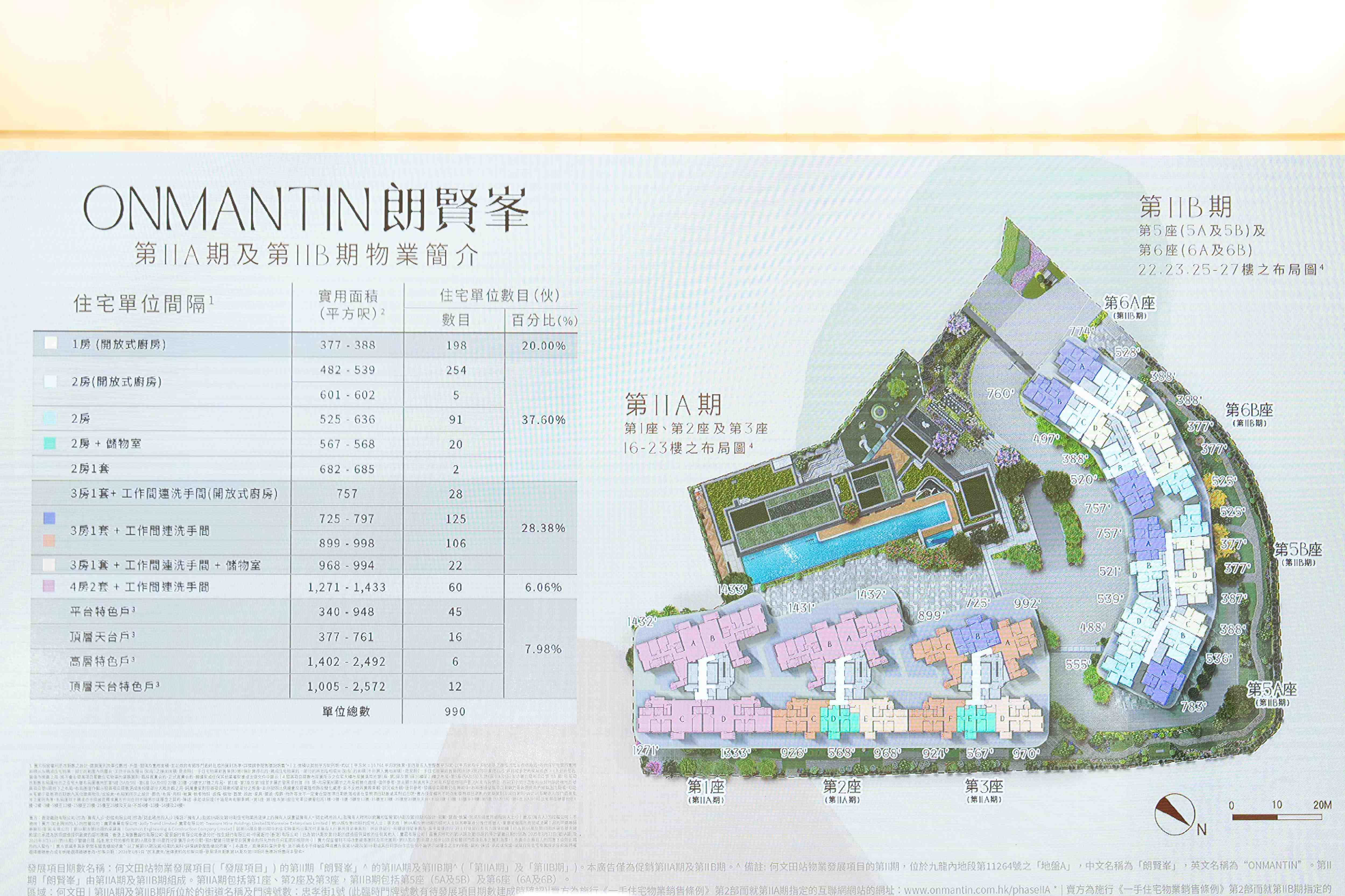 戶型分布方面,項目主打兩房涉372伙,佔全盤約38%,實用面積由482至685方呎;三房提供281伙或約28%,實用面積由725至998方呎;一房佔198伙或約20%,實用面積由377至388方呎;四房提供60伙或約6%,實用面積由1,271至1,433方呎。另設平台及頂層等特色戶,佔79伙或約8%,實用面積由340至2,572方呎。