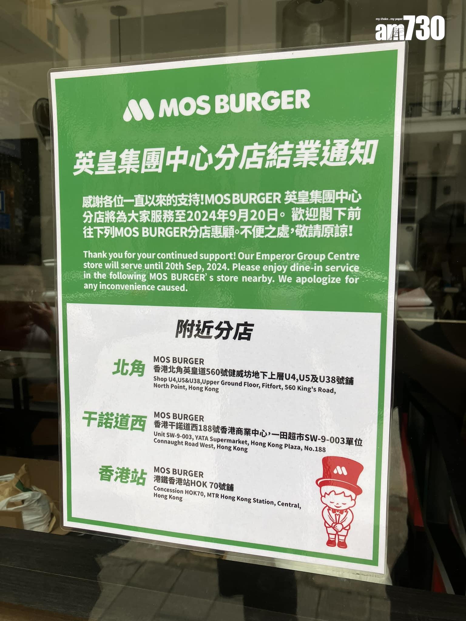 日式連鎖漢堡快餐店MOS Burger(摩斯漢堡)於11日內有兩間分店結束營業,引起網民留意。當中尖沙咀K11 Art Mall於本月10日結業,緊接至本月20日到灣仔英皇集團中心分店結業。