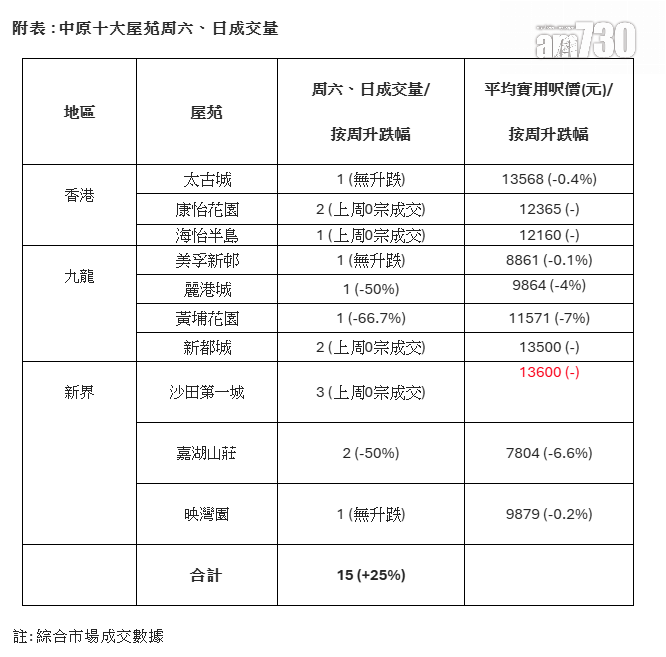 二手交投氣氛暢旺,據中原地產統計,十大屋苑本周末(5及6日)全部有成交,合共錄得15宗買賣,按周升25%,連升3周,並創下4周新高。當中沙田第一城錄得3宗交投表現最活躍,其次為康怡花園、新都城及嘉湖山莊,各錄2宗成交,其餘屋苑各錄得1宗成交。