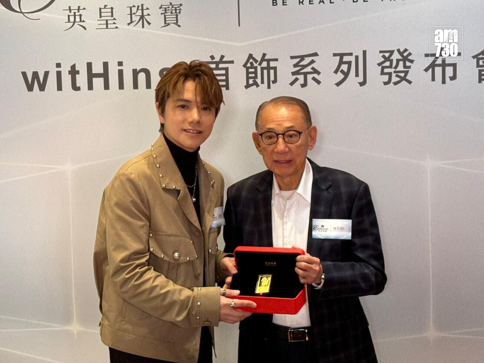 張敬軒今日中午現身灣仔,獲老闆楊受成送上金牌。 (娛樂組攝)