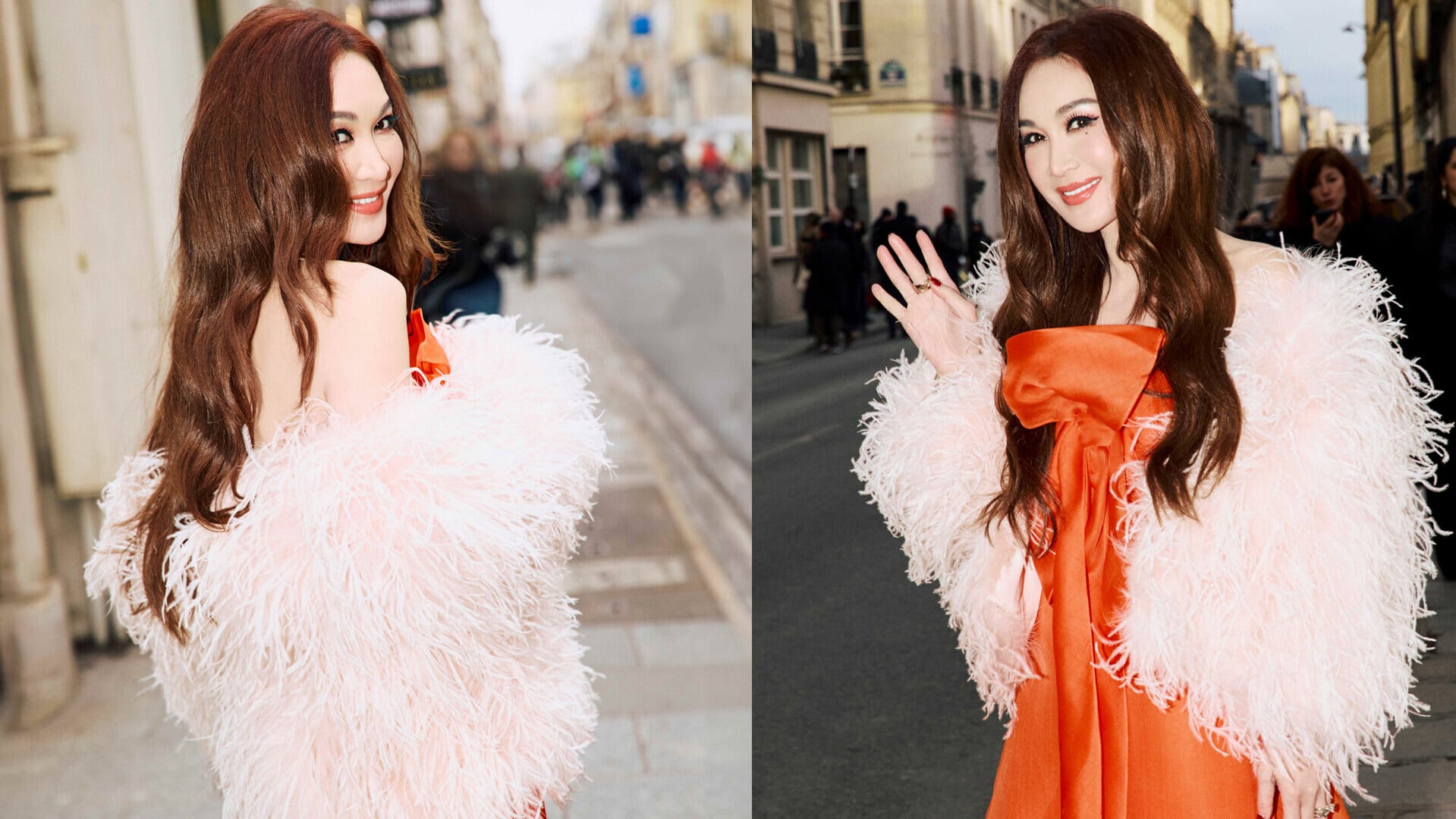 溫碧霞(Irene)應國際時裝品牌 Dior之邀出席巴黎時裝周,以鮮橙色春裝露肩長裙造型亮相,配合白色羽毛披肩,散發高貴與飄逸,瞬間成為外國傳媒爭相拍攝的焦點。她的造型既呼應巴黎的浪漫優雅,又展現東方女性的自信與柔美。