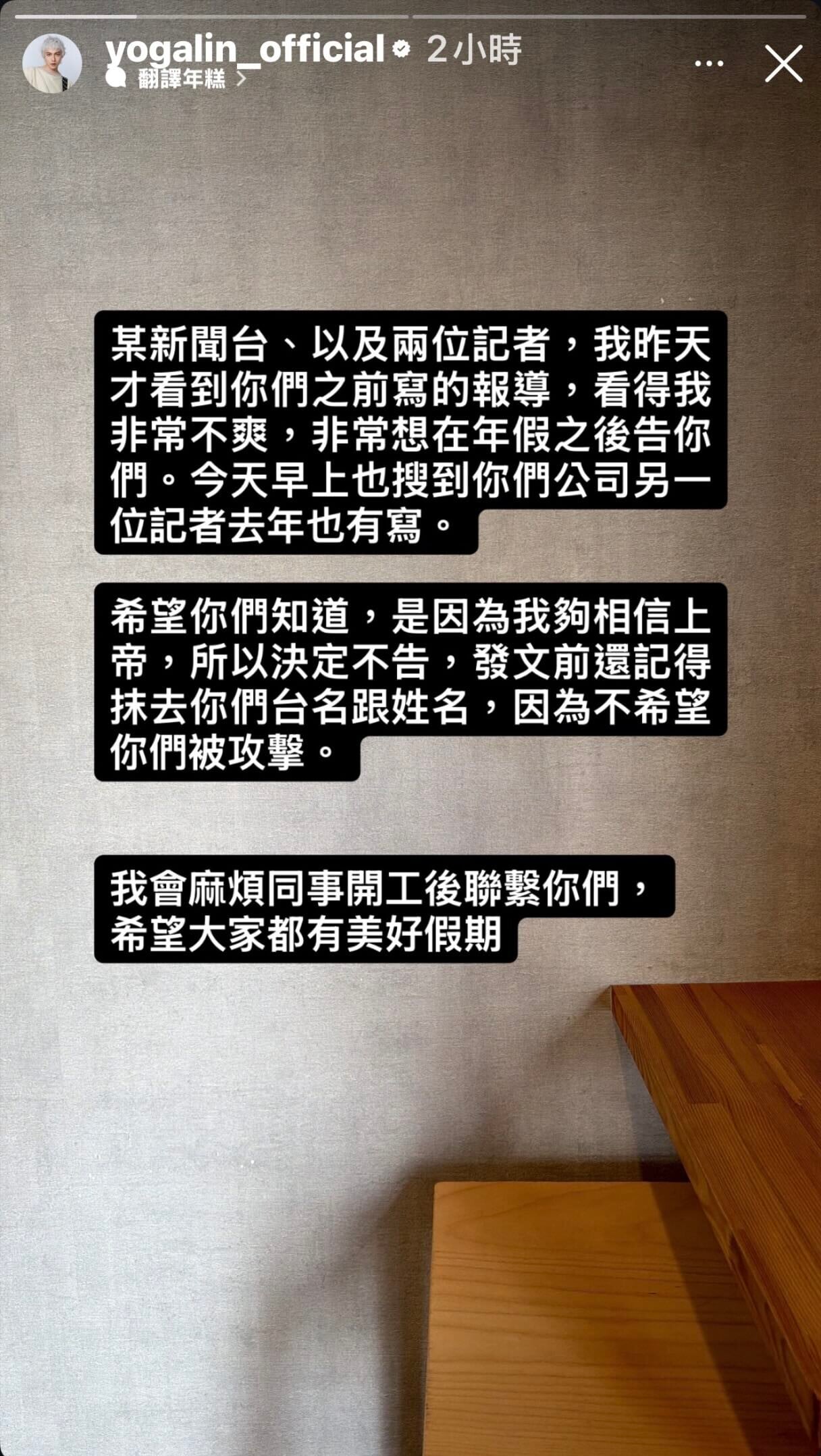 林宥嘉寫道︰「某新聞台、以及兩位記者,我昨天才看到你們之前寫的報導,看得我非常不爽,非常想在年假之後告你們。今天早上也搜到你們公司另一位記者去年也有寫。希望你們知道,是因為我夠相信上帝,所以決定不告,發文前還記得抹去你們台名跟姓名,因為不希望你們被攻擊。我會麻煩同事開工後聯繫你們,希望大家都有美好假期。」