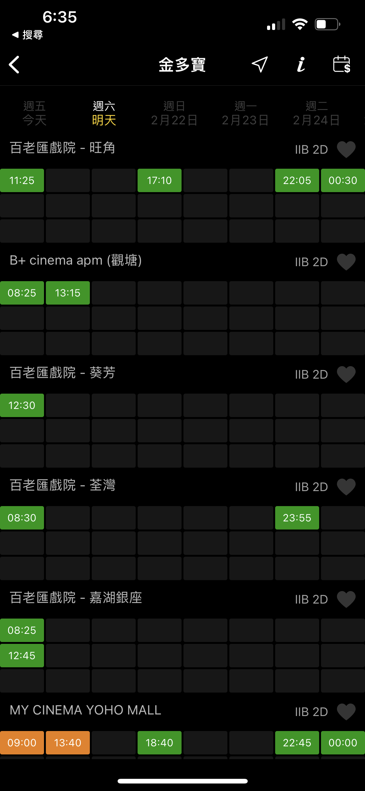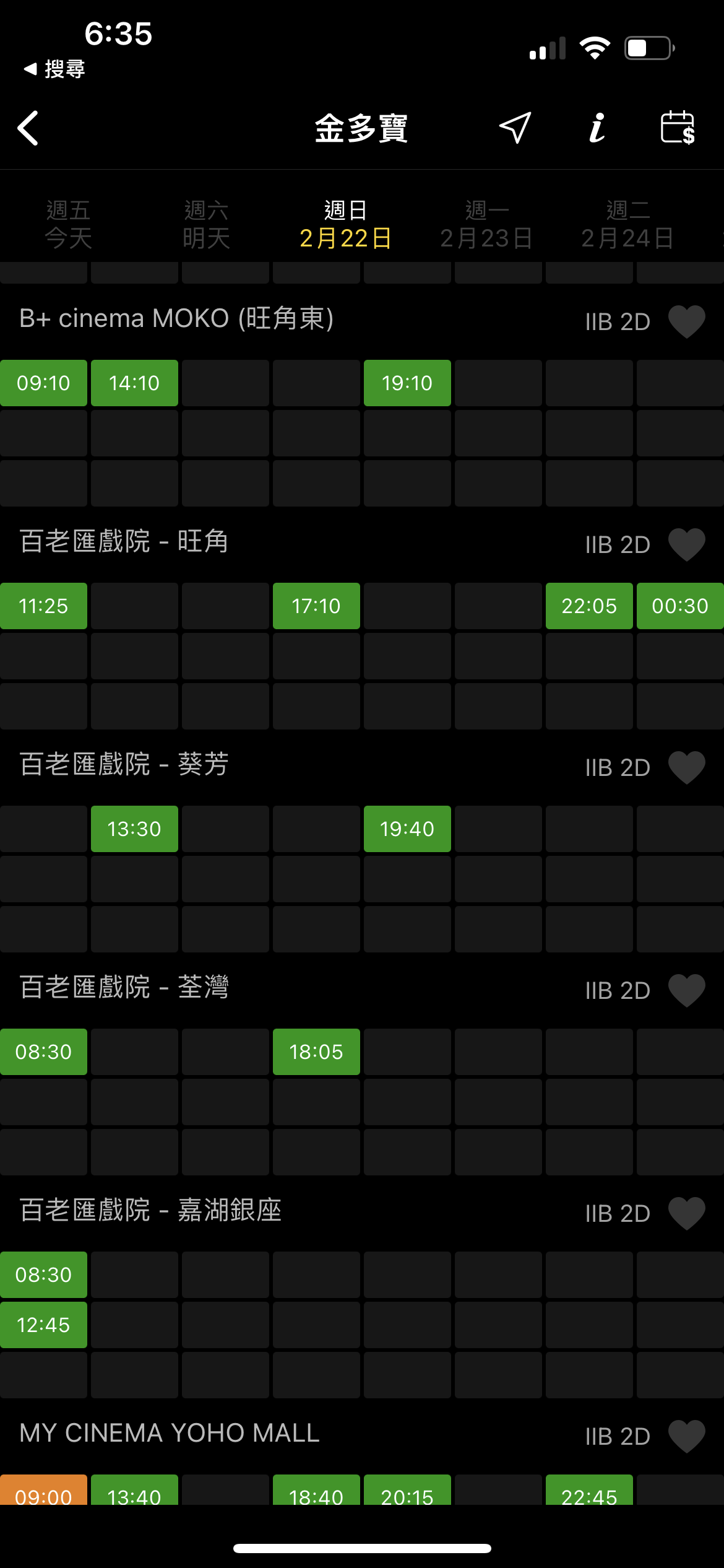 有網民發現《金多寶》的排片量少,部份戲院更出現天地更。記者以程式搜尋《金多寶》周六(20日)的情況,見到其他院線在不同時段都有上映,雖排片量不及《夜王》,但總算平均,唯獨是百老匯院線排片少得可憐。以葵芳百老匯為例,只得中午12時30分的場次,荃灣百老匯則出現天地場,早場為上午8時30分,夜場是晚上11時55分,部份更只會播放上午時段。
