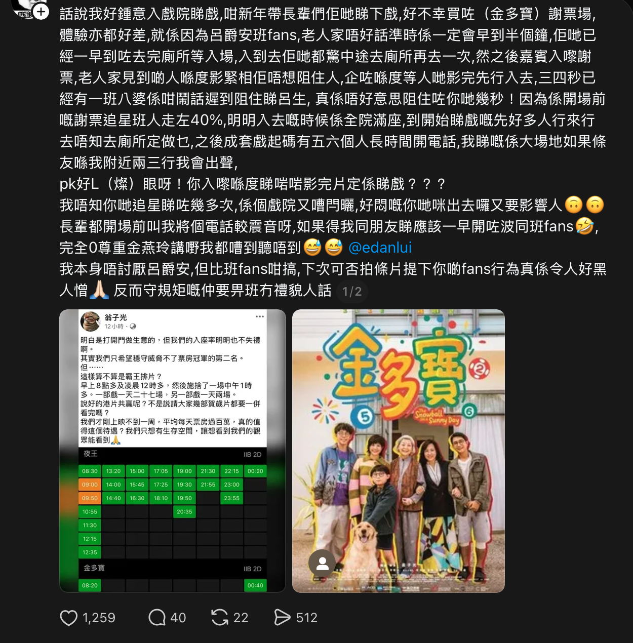 網民提到跟兩老入場睇戲,誤打誤撞是謝票場。由於老人家擔憂中途去廁所,所以在開場前去洗手間。適逢是開場前謝票,老人家去完洗手間之後,遇上一眾演員入場,網民說:「老人家見到啲人喺度影緊相佢唔想阻住人,企咗喺度等人哋影完先行入去,三四秒已經有一班八婆係咁鬧話遲到阻住睇呂生,真係唔好意思阻住咗你哋幾秒!」當演員離開之後,場內由全院滿座變到餘下4成觀眾。然而,之後又出現另一問題,「好多人行來行去唔知去廁所定做乜,之後成套戲起碼有五六個人長時間開電話,我睇嘅係大場地如果條友喺我附近兩三行我會出聲,pk好L(燦)眼呀!你入嚟喺度睇啱啱影完片定係睇戲??? 我唔知你哋追星睇咗幾多次,係個戲院又嘈閂曬,好悶嘅你哋咪出去囉又要影響人。長輩都開場前叫我將個電話較震音呀,如果得我同朋友睇應該一早開咗波同班fans,完全0尊重,金燕玲講嘢我都嘈到聽唔到!」