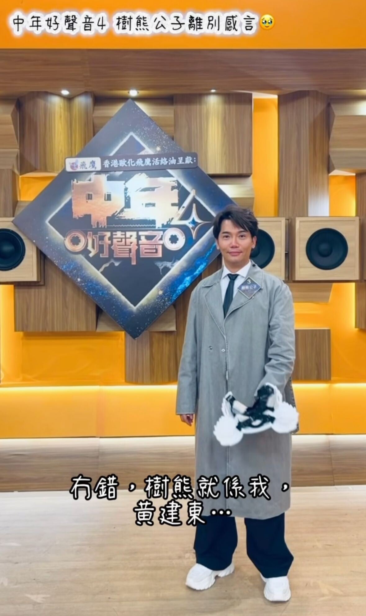 黃建東日前以「樹熊公子」參加《中年好聲音4》獻唱《可惜我是水瓶座》,但無緣晉升被淘汰。