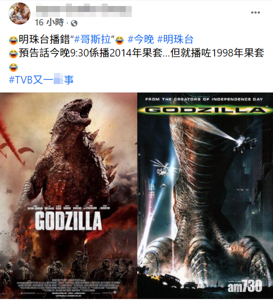 事緣無綫早前播出的預告片是2014年的《哥斯拉》,此片由「緋紅女巫」伊莉莎伯奧遜(Elizabeth Olsen)及「快銀」亞倫強森(Aaron Taylor-Johnson)主演,惟昨晚播出的竟然是98年版本,翻查明珠台的節目表,簡介也是98年電影《哥斯拉》內容。