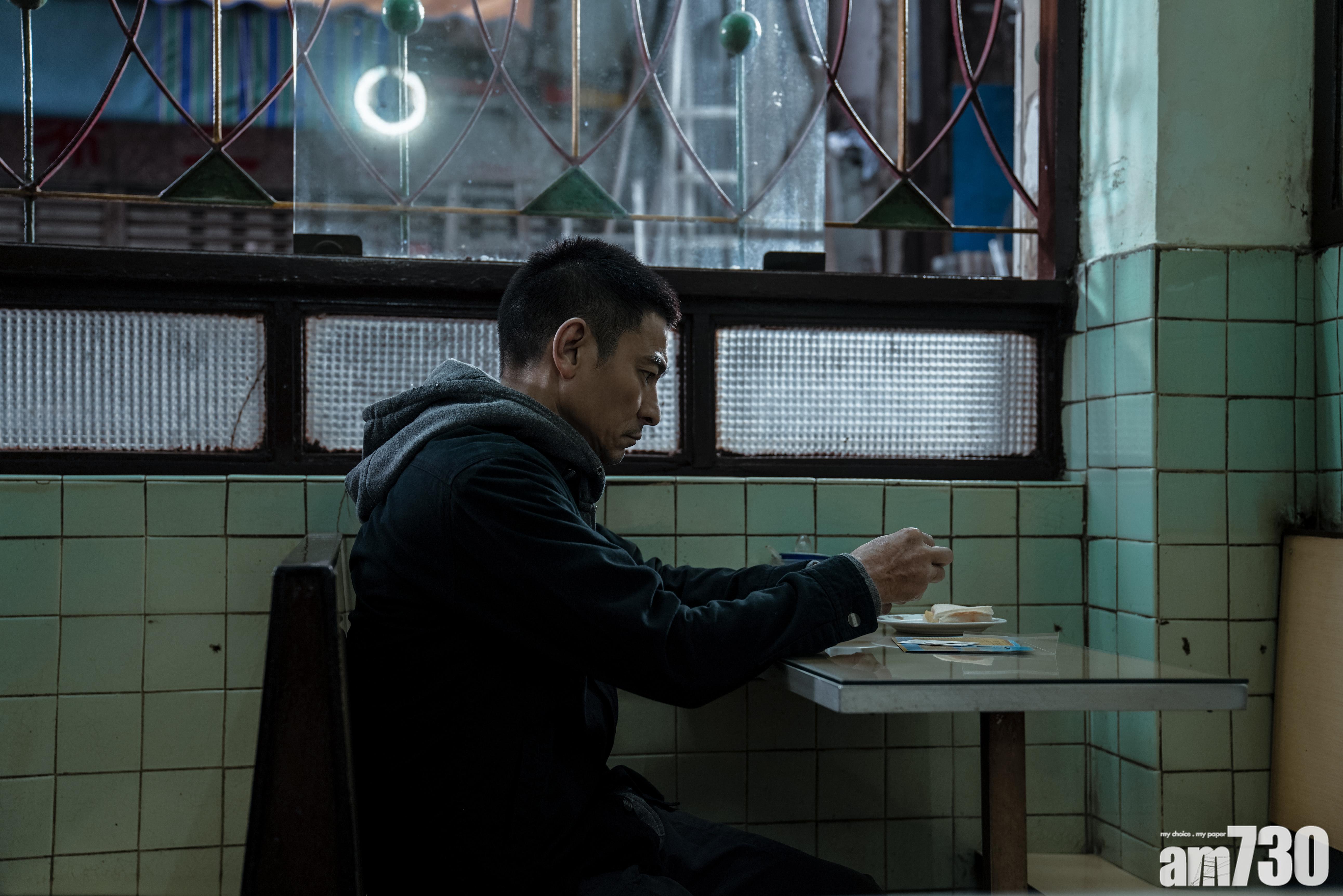華仔在戲中淪為通緝犯,獨個兒踎茶餐廳。