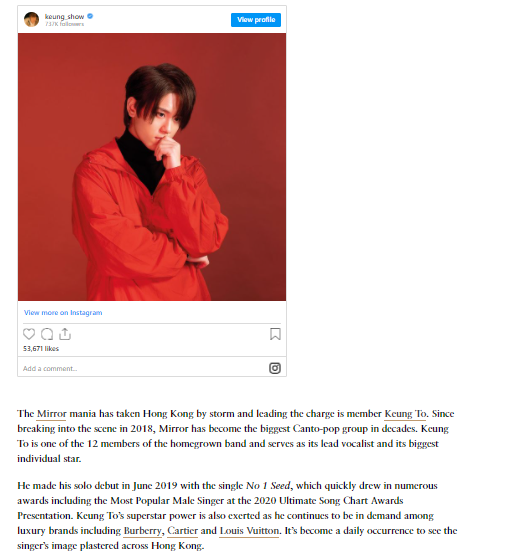 該雜誌以對本地及亞洲帶來的影響,以及推動亞洲發展為評選原則。作為香港炙手可熱的男歌手,姜濤今年再次獲選,雜誌形容姜濤的「superstar power(超級巨星影響力)」令他成為各大國際名牌的新寵兒,身影遍布香港的大街小巷。姜濤與另一位印尼華裔歌手Rich Brian同屬22歲,是最年輕的兩位。