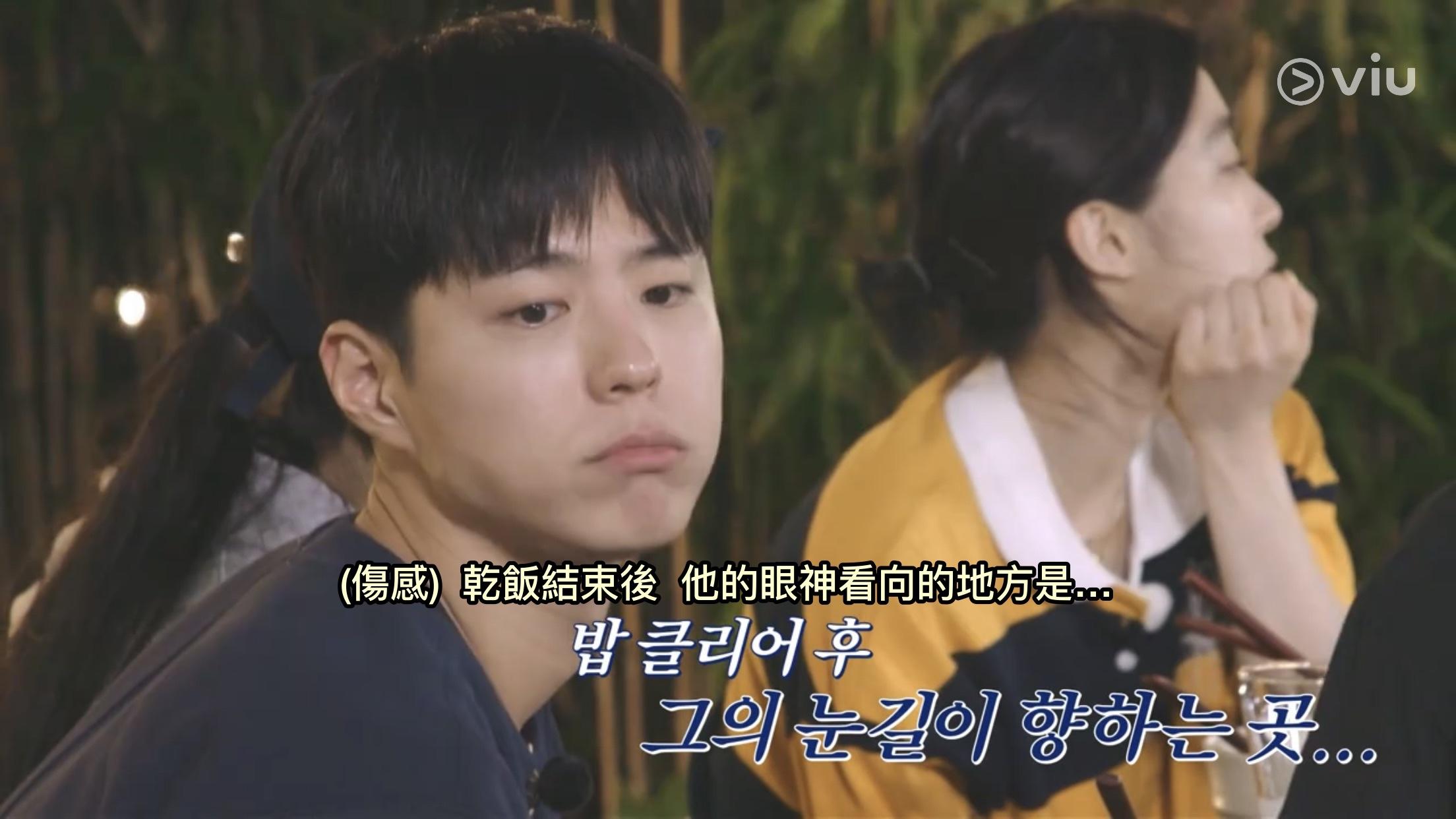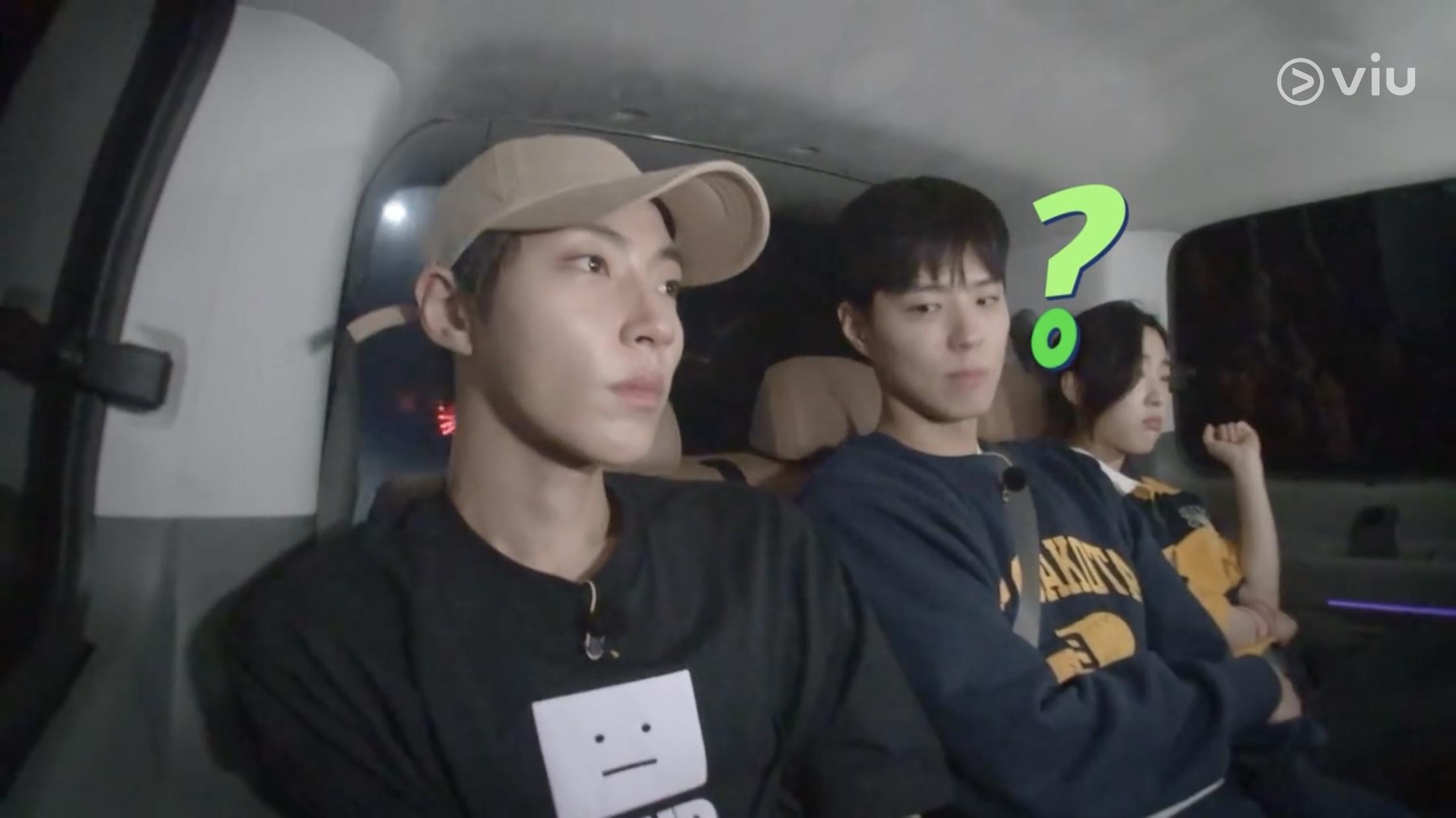 原來朴寶劍(左一)的注意力只集中在烤肉上。 朴寶劍被粉絲發現眼神飄移。緊盯著遠處的烤肉。 朴寶劍發現黃寅燁被鬼故嚇親。 黃寅燁被鬼故嚇到緊捉安全帶。 朴敘俊與池昌旭。