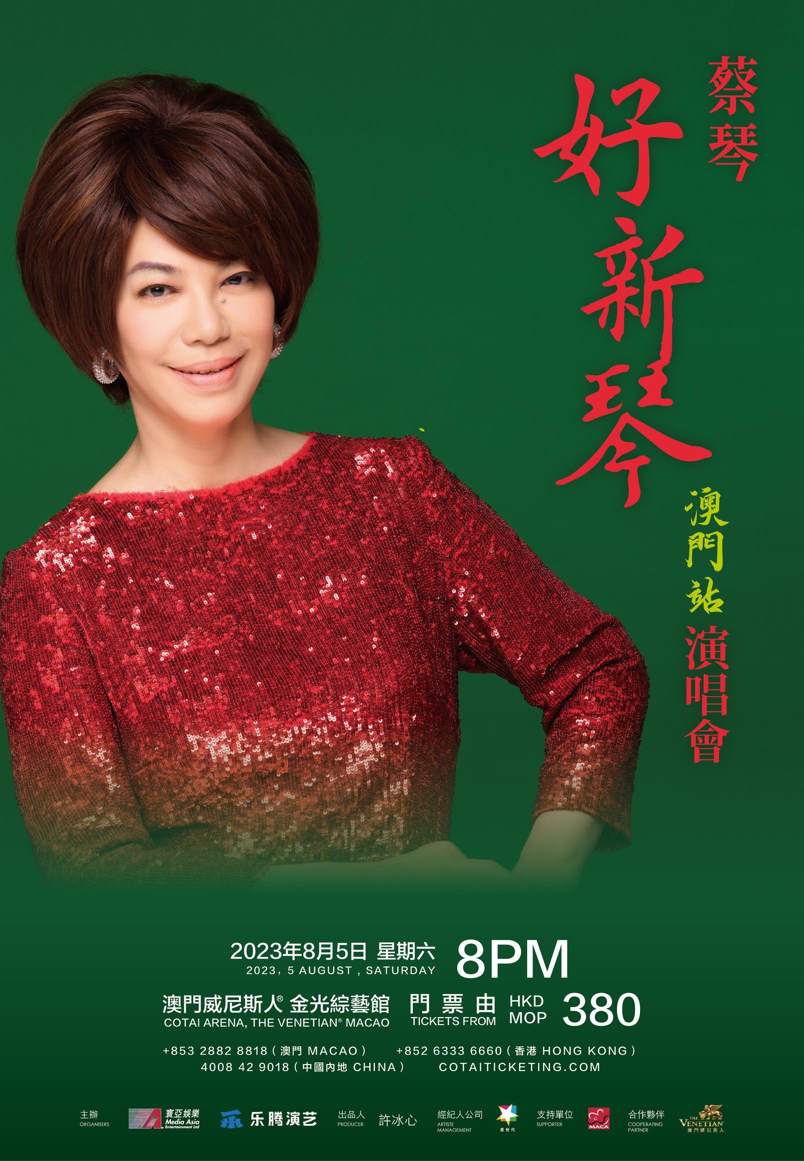 叱吒樂壇40多年的歌后蔡琴將於8月5日假澳門威尼斯人金光綜藝館舉行《蔡琴「好新琴」澳門站演唱會》,門票已正式公開開售。這是蔡琴時隔四年再次踏上澳門站舞台舉辦個人演唱會,令一班歌迷萬分期待。