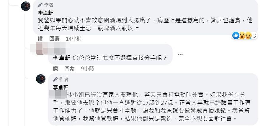 還有網友問認為林靖恩讓李坤城過得開心,拿到遺產也是應該,李卓軒則回:「我爸如果開心就不會故意酗酒喝到大腸癌了,病歷上是這樣寫的,鄰居也證實,他近幾年每天喝威士忌一瓶啤酒六瓶以上。」