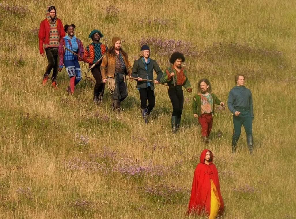 照片中一位女演員穿上白雪公主標誌性的藍黃色連衣裙,搭配紅色斗篷。
