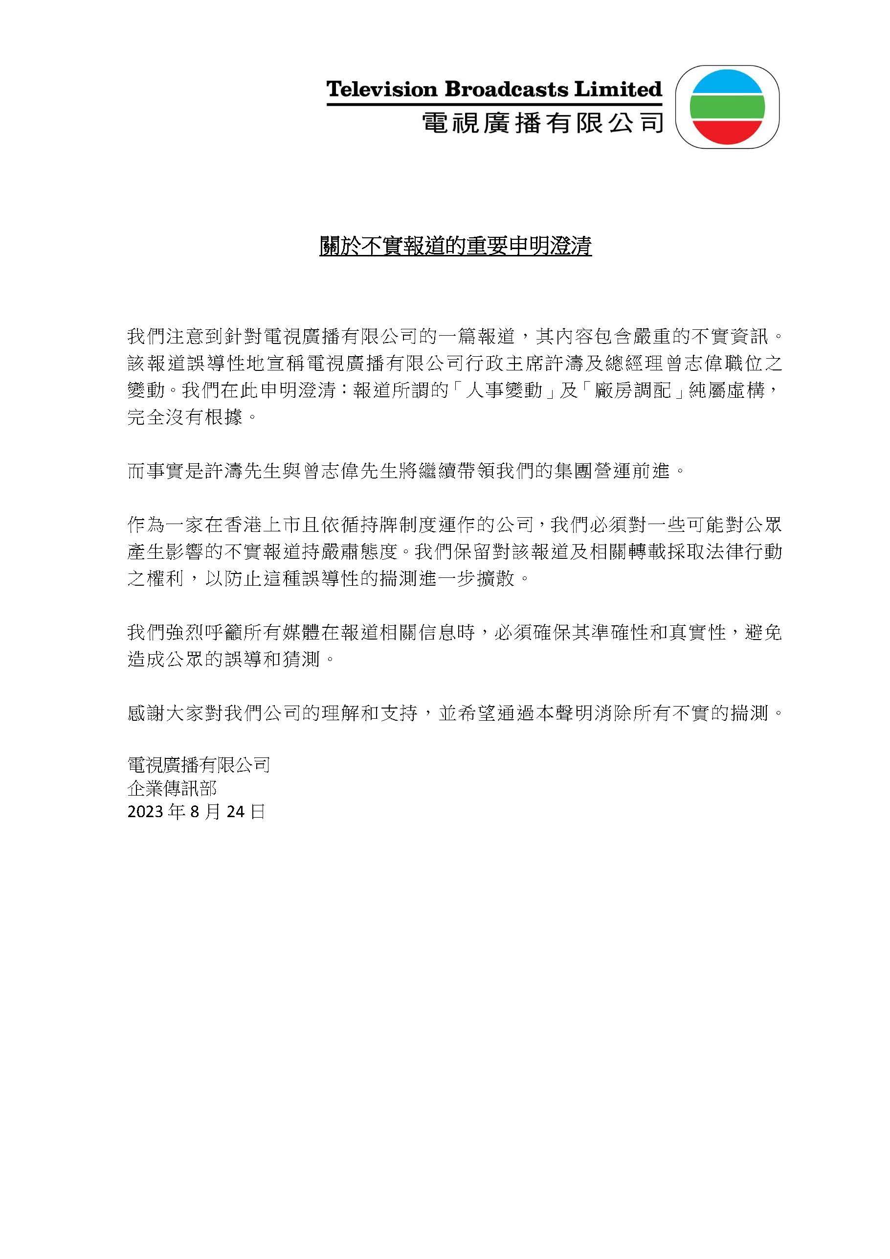 距離報道「出街」不足兩個小時後,電視廣播有限公司發布「關於不實報道的重要申明澄清」,指出有關報道內容「包含嚴重的不實資訊,誤導性地宣稱許濤及曾志偉職位之變動」,澄清報道所謂的「人事變動」及「廠房調配」純屬虛構,完全沒有根據。同時保留對該報道及相關轉載採取法律行動之權利,以防止這種誤導性的揣測進一步擴散。