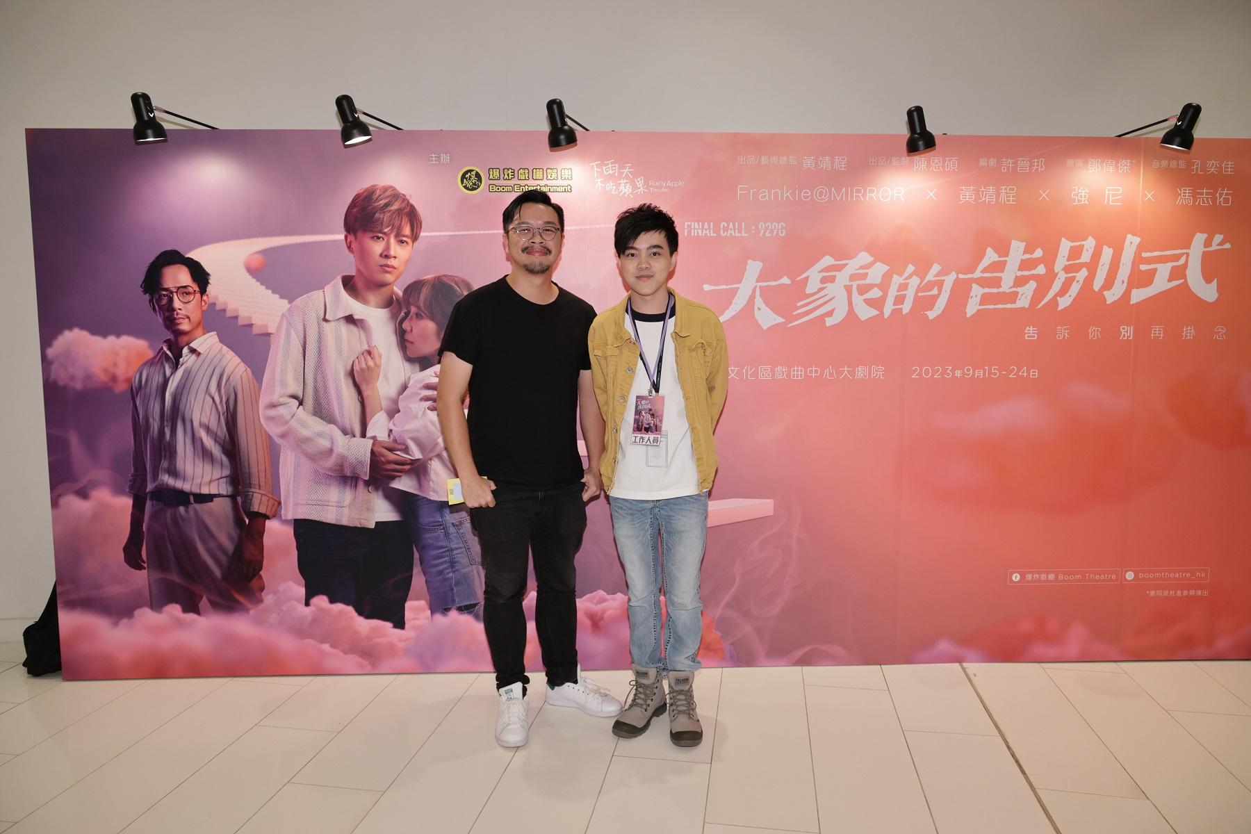 由MIRROR成員陳瑞輝(Frankie) 強尼、黃靖程(十小龍)及馮志佑主演的音樂劇《大象的告別式》,繼兩場優先預演後,昨晚(16日)於戲曲中心大劇院隆重首演,獲不少圈中人親身捧場,包括容祖兒、楊樂文(Lokman)、王智德(Alton)、邱傲然(Tiger)、鄭丹瑞、陳淑芬、葛綽瑤、蘇皓兒、吳海昕、何爵天導演等星光熠熠,場面熱鬧。