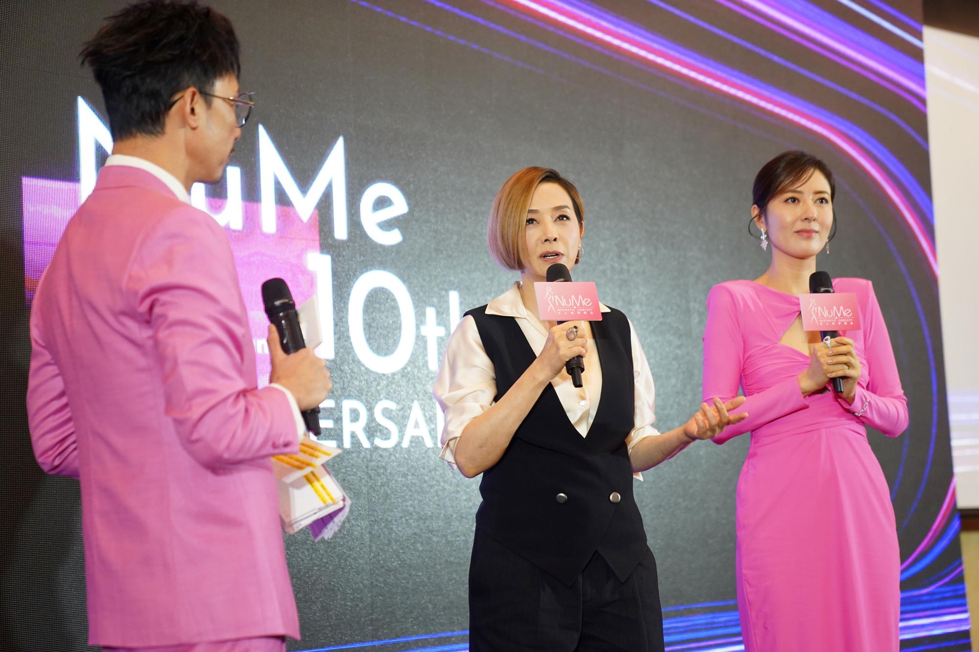 影后毛舜筠與視后唐詩詠願意今日出席醫美品牌NuMe十周年活動,二人更在活動上擔任評判及頒獎嘉賓。唐詩詠為迎合品牌的「粉紅療程」,特別以一身粉紅色開胸連身裙出現,Mo姐亦以低V中性打扮示人,有型有款。