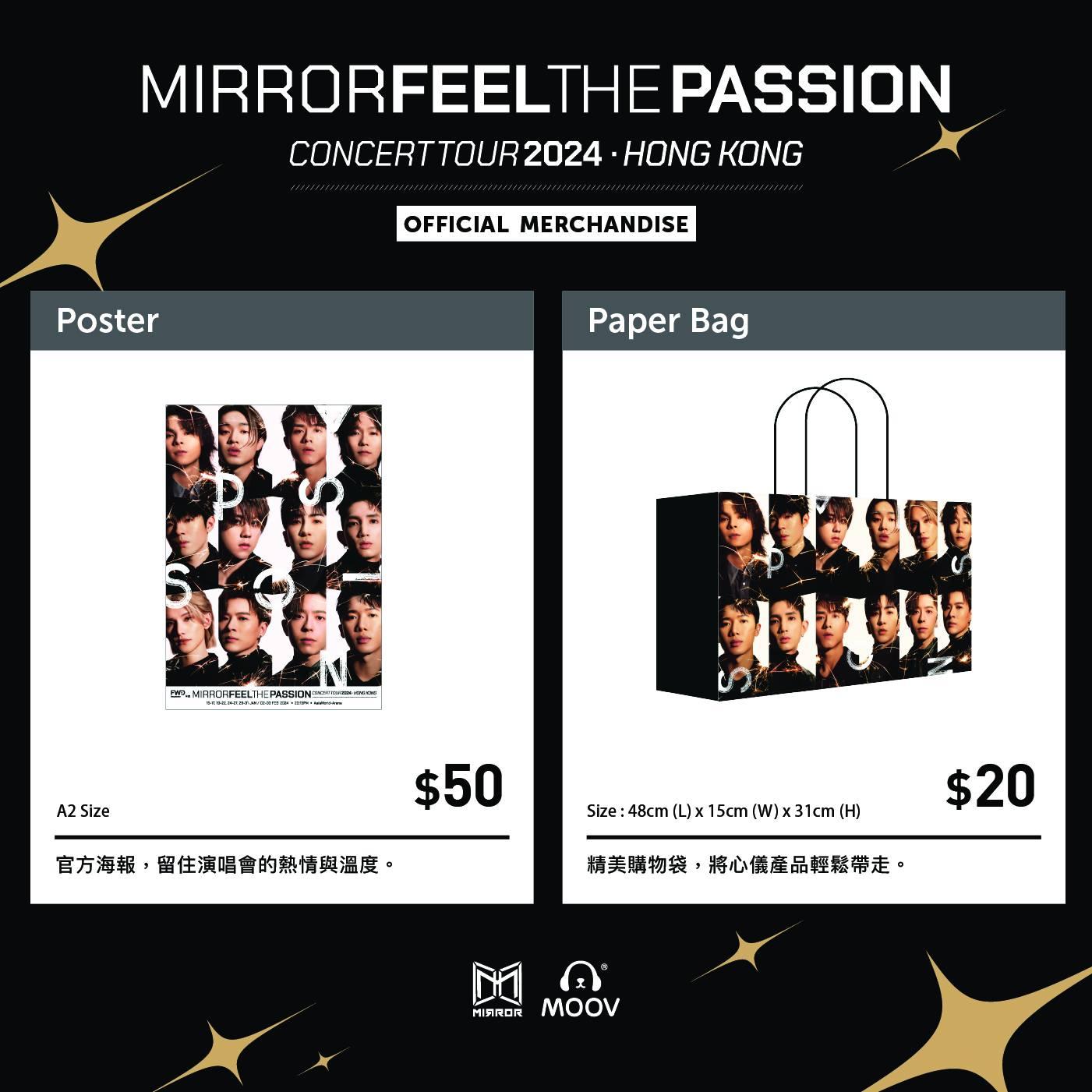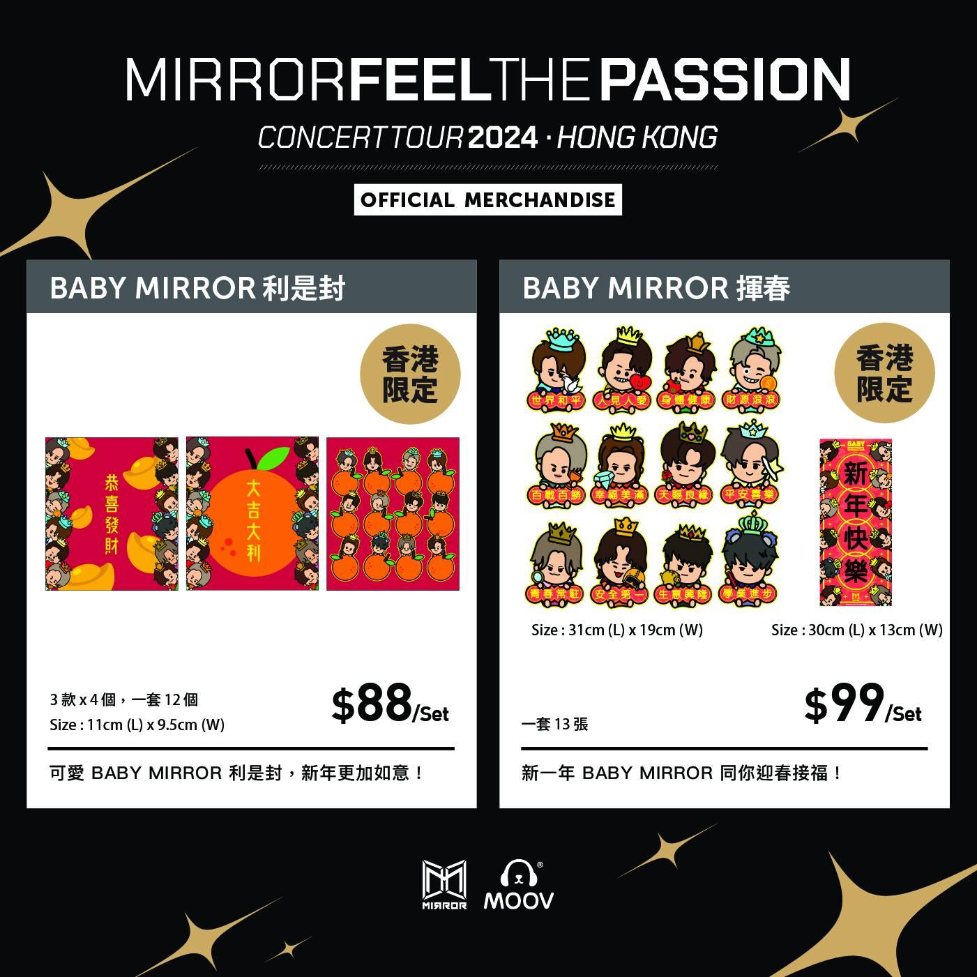 昨日MIRROR的專頁公布今次個唱的周邊產品,除了有毛巾、Tee恤、名信片、相集外,更有標明「香港限定」的Baby MIRROR利是封及揮春。