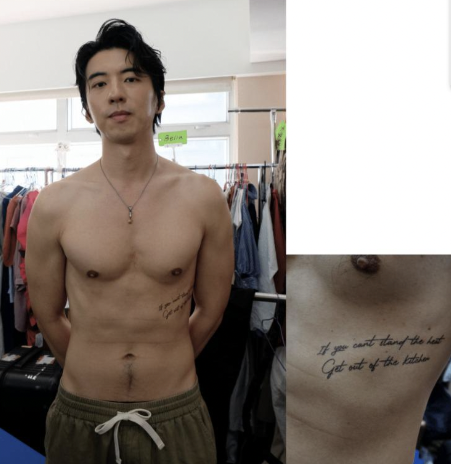 本周開播的ViuTV劇集《瑪嘉烈與大衛系列 絲絲》,昨晚(26)播出的一集以「感情.舊事」為主題,演「烈火」的傅孟柏經常半裸煮食,大騷鋼條型身材,導演特意為烈火加上獨特紋身字句”If you can't stand the heat, get out of the kitchen”,此句來源於前美國總統杜魯門其中一段名言,除意指烈火身為名廚的職業身份外,亦代表烈火對自我及團隊要求極高,在他眼中,若是承受不了保持巔峰的壓力,就沒有資格繼續留在廚房。