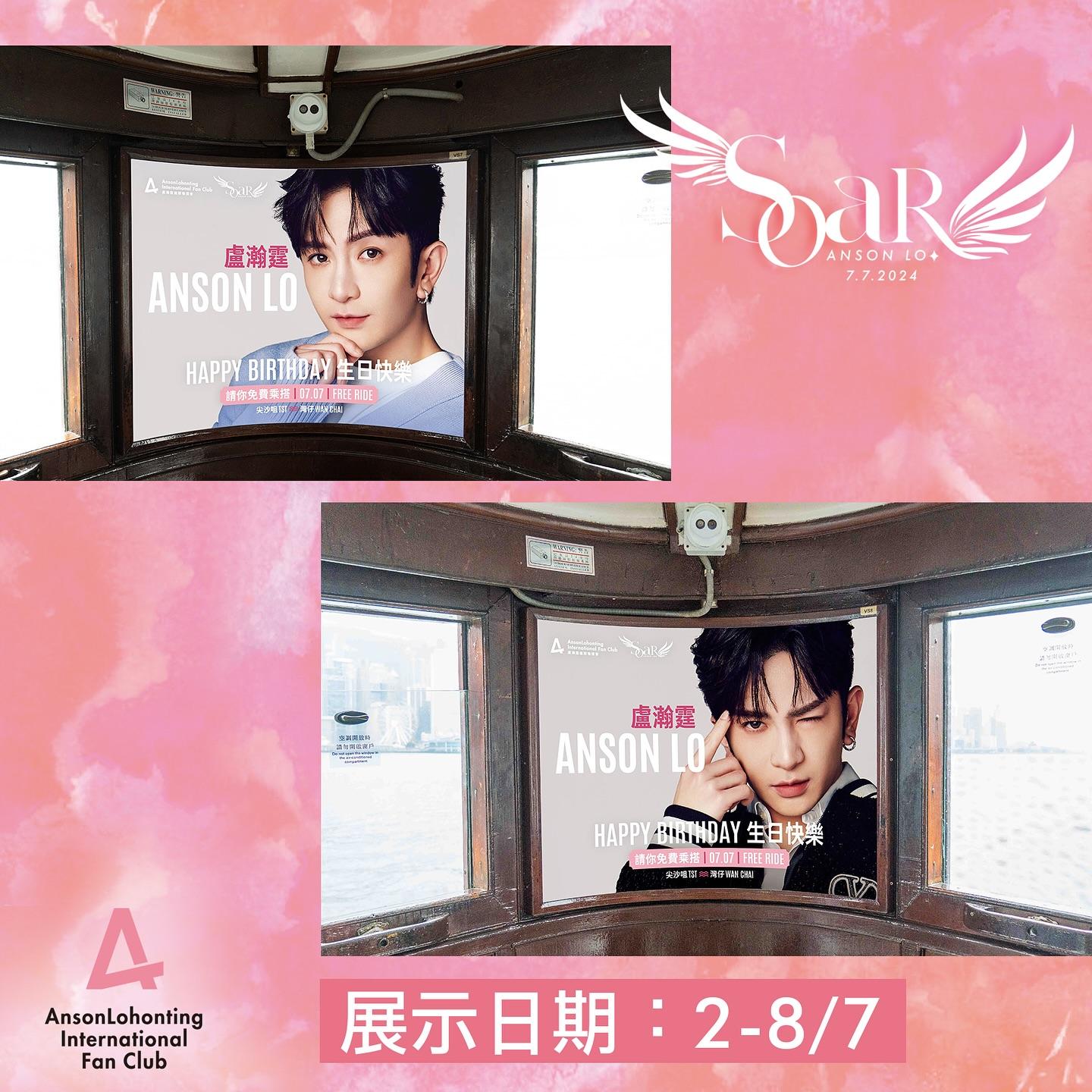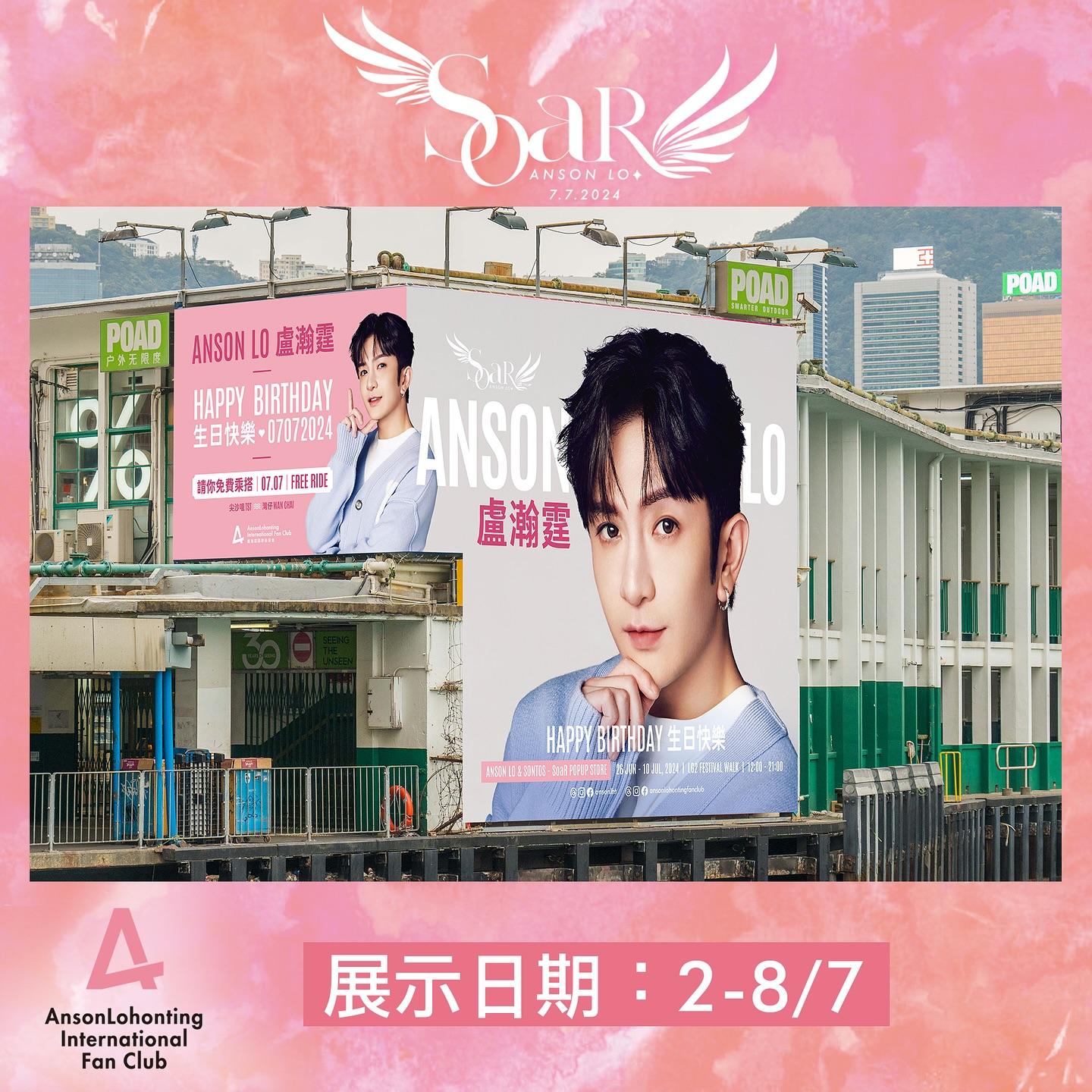 Anson Lo盧瀚霆國際後援會今年於又一城,一連兩星期舉辦《Anson Lo & Sontos - SoaR Pop Up Store》。場內設有多個打卡位,更展出Anson Lo於MIRROR演唱會穿著過水晶鑽石戰衣。當然少不了必買場內限定周邊,收入將扣除成本後將全數捐出。