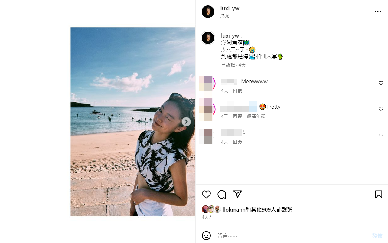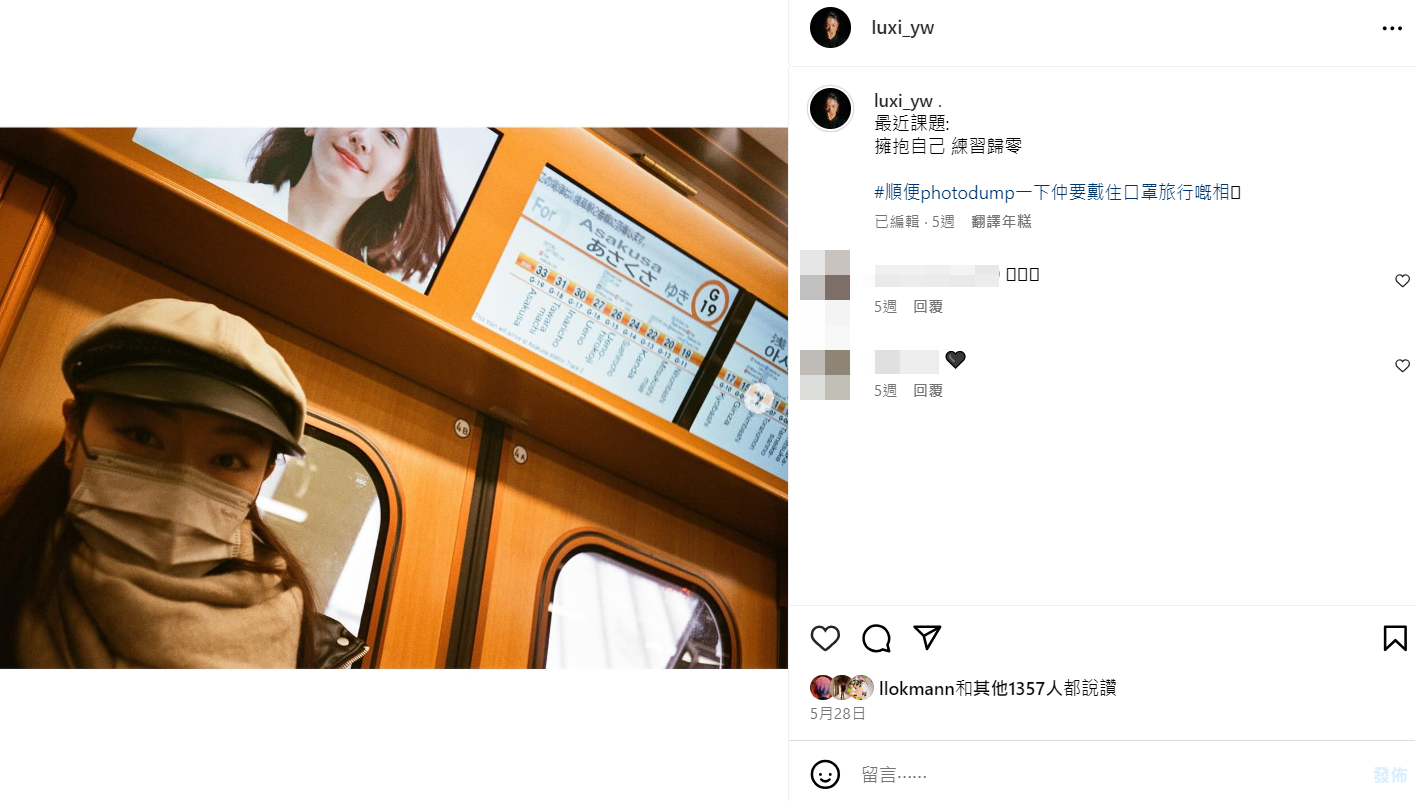 翻開女方的IG,她連日來貼出在台灣澎湖旅行的照片,Lokman亦有讚好。Luxi在5月底上載一張舊照,留言說︰「最近課題︰擁抱自己 練習歸零」如今看來,似是暗示自己的感情狀況。