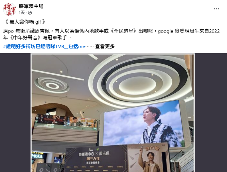 在活動開始前,有將軍澳的網民出po以「無人識你喎gif」為題,寫道︰「無街坊識周吉佩,有人以為佢係內地歌手或《全民造星》出嚟嘅,google 後發現周生來自2022年《中年好聲音》嘅冠軍歌手。」並打上hashtag「證明好多街坊已經唔睇TVB__包括me」此po隨即引來不少討論,有人留言指對方已出道多年,「佢做左歌手好耐,係中年攞冠軍後多D人識」、「好多年前上過有線」等等,當然亦有不少人留言稱「依家個乜水?」、「佢有咩自己既歌呢其實?」