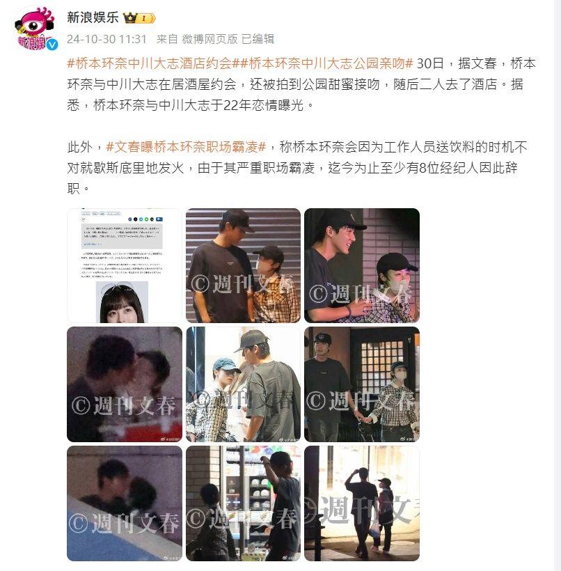 此外,橋本環奈也被《週刊文春》目擊與中川大志甜蜜約會,2人2022年被爆出秘戀,當時雙方公司僅回應「私事交由本人處理」,雖然沒有正面承認戀情,但仍被外界視為默認,而小倆口近日不僅被直擊共同用餐、牽手,更是在公園熱吻,亦是首度被拍到甜蜜同框照。