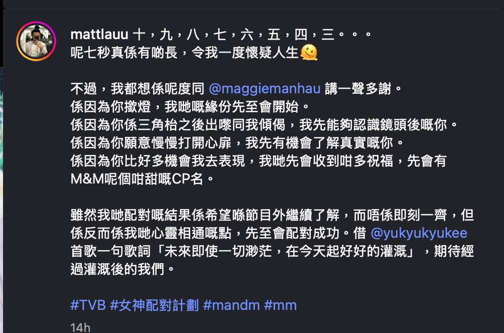Matt其後在社交平台寫下今次參加節目的感受,感謝梁敏巧選擇他:「因為你按燈,我們緣分才會開始。因為你在三角桌之後出來跟我聊天,我才認識鏡頭後的你。因為你願意慢慢打開你的心扉,我才有機會了解真實的你。」並指二人選擇在節目外「繼續了解」,而非即時成為情侶,但他認為這恰恰是他們「心靈相通」的證明。