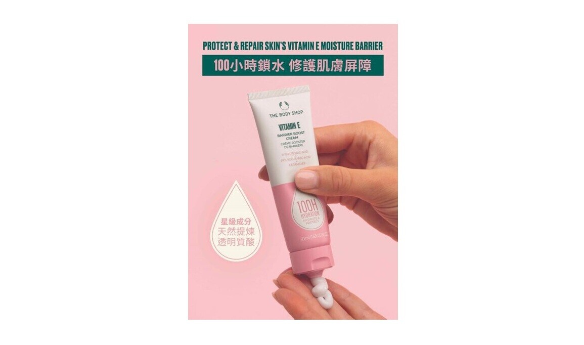隨著天氣轉涼及環境變化,加上長時間處於冷氣及都市之中,肌膚的天然保濕屏障正承受前所未有的壓力,肌膚乾燥、繃緊及敏感問題愈趨普遍!The Body Shop維他命E補濕屏障滋潤面霜,全新面霜專為修護及強化肌膚天然保濕屏障而設,使用後30分鐘可提升肌膚97%的補濕度,並能提供長達100小時持續保濕效果。更有助抗氧化,讓肌膚對抗環境壓力,修護並鞏固肌膚屏障,減低乾燥緊繃感。使用後肌膚倍感柔軟細緻,有效抵禦乾燥侵襲,特別適合秋冬季節及長時間於冷氣環境使用。適合乾性、極乾性還是敏感肌,建議可於一般護膚程序後使用,再用防曬,上妝貼服度會更明顯。