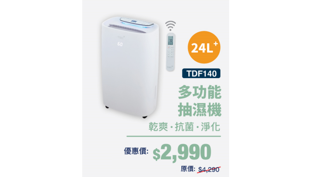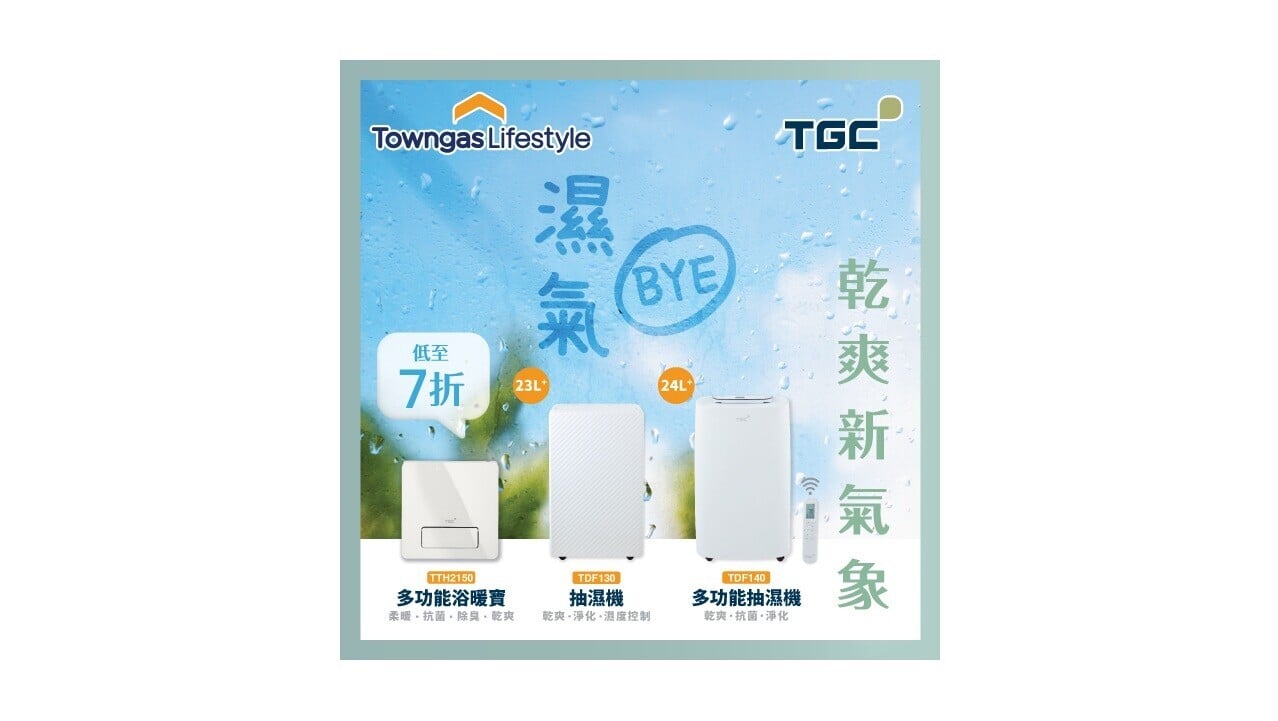 回南天一到,濕度急升,家居即變「水簾洞」!牆身地板「出水」、天花出現霉斑、家具受潮變形、衣物難乾兼散發陣陣難聞「噏味」,潮濕環境更易成為細菌、霉菌、塵蟎與其他致敏原的「天堂」,隨時誘發氣喘、支氣管炎、過敏性鼻炎等問題,影響一家大小健康!面對潮濕大敵,TGC 特別推出春日家電優惠*,精選抽濕機7折起,多功能浴暖寶加購優惠價僅需$2,280,全部 均獲 1 級能源效益認證,更包3年保養服務,助您輕鬆擊退春日濕氣,重拾乾爽舒適的家居環境!