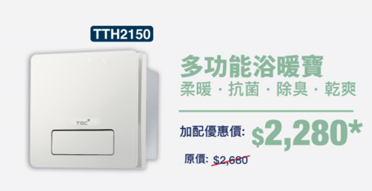 浴室作為家中濕氣重災區,往往最易成為霉菌滋生的「黃金地段」,更需加倍防護!TGC多功能浴暖寶TTH2150配備石墨烯活性碳過濾網,高效除臭、抗菌、抗病毒,結合負離子淨化技術,24小時保持空氣清新潔淨,全天候守護浴室衛生。「熱烘」功能快速烘乾衣物毛巾,杜絕霉味;「換氣」功能則有效排走濕氣,防止「倒汗水」及霉菌形成,保持浴室乾爽舒適。無論是春日烘乾衣物,還是冬季保暖防寒,一機即可滿足全年所需。約8吋纖巧機身突破空間限制,安裝靈活自如,完美融入香港細小浴室,配合抽出式設計,日後保養維修更方便。現購買任何TGC/ SIMPA / Mia Cucina 產品及或家居用品,只需以優惠價$2,280即可加購TGC 多功能浴暖寶 TTH2150 一部,更可享窗口式標準安裝半價($240)。把握機會入手,與抽濕機雙劍合璧,徹底解決全屋潮濕問題!