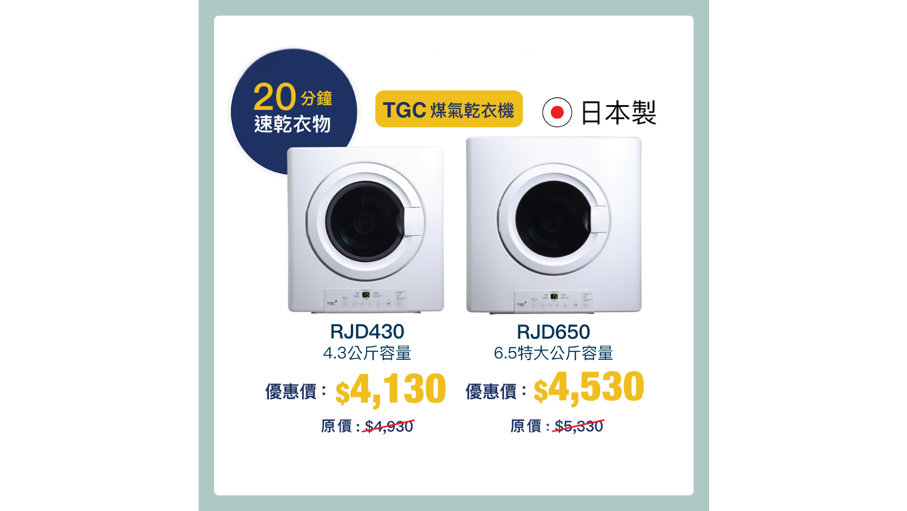 想乾衣、除菌、除蟎、除霉一步到位,家中當然必備煤氣乾衣機!日本製 TGC 煤氣乾衣機以高 效熱循環技術乾衣,只需45分鐘^即可高溫極速乾透4公斤衣物,烘乾時可提升至高達80°C的高溫,有效殺滅常見家居細菌如大腸桿菌及霉菌#,輕鬆擊退噏味及細菌,守護一家人的健康。此外更特設20分鐘「速乾」功能,瞬間烘乾1公斤衣物,從此晴天全年無休,無論任何時刻都可以擁抱乾爽好心情。即日起至2026年5月15日前選購TGC煤氣乾衣機,即可享現金折扣高達$800*,更可免費獲贈安裝架(價值$760)及排濕喉(價值$450)。