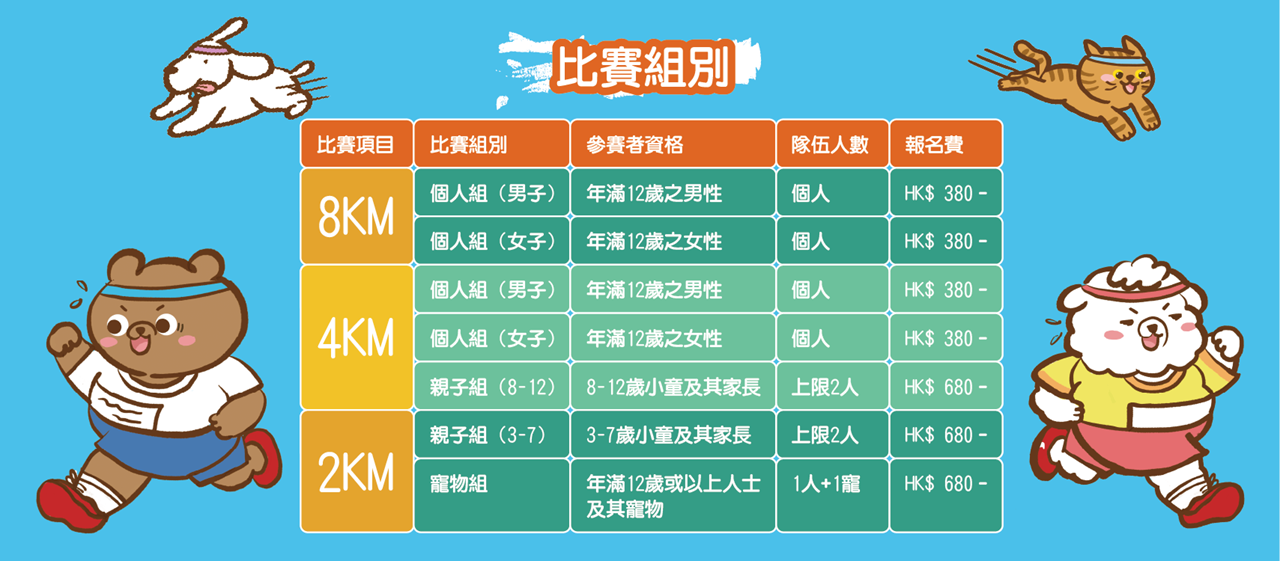 設有 8公里挑戰組、4公里樂遊組、2公里輕鬆組,無論你是追求PB嘅跑手,定係想輕鬆Hea跑、享受氣氛嘅朋友,總有賽道適合你!特別為家庭同寵物主人設立嘅 「親子組」及「寵物組」,讓你同摯愛嘅小朋友、毛孩一齊創造難忘週末回憶!