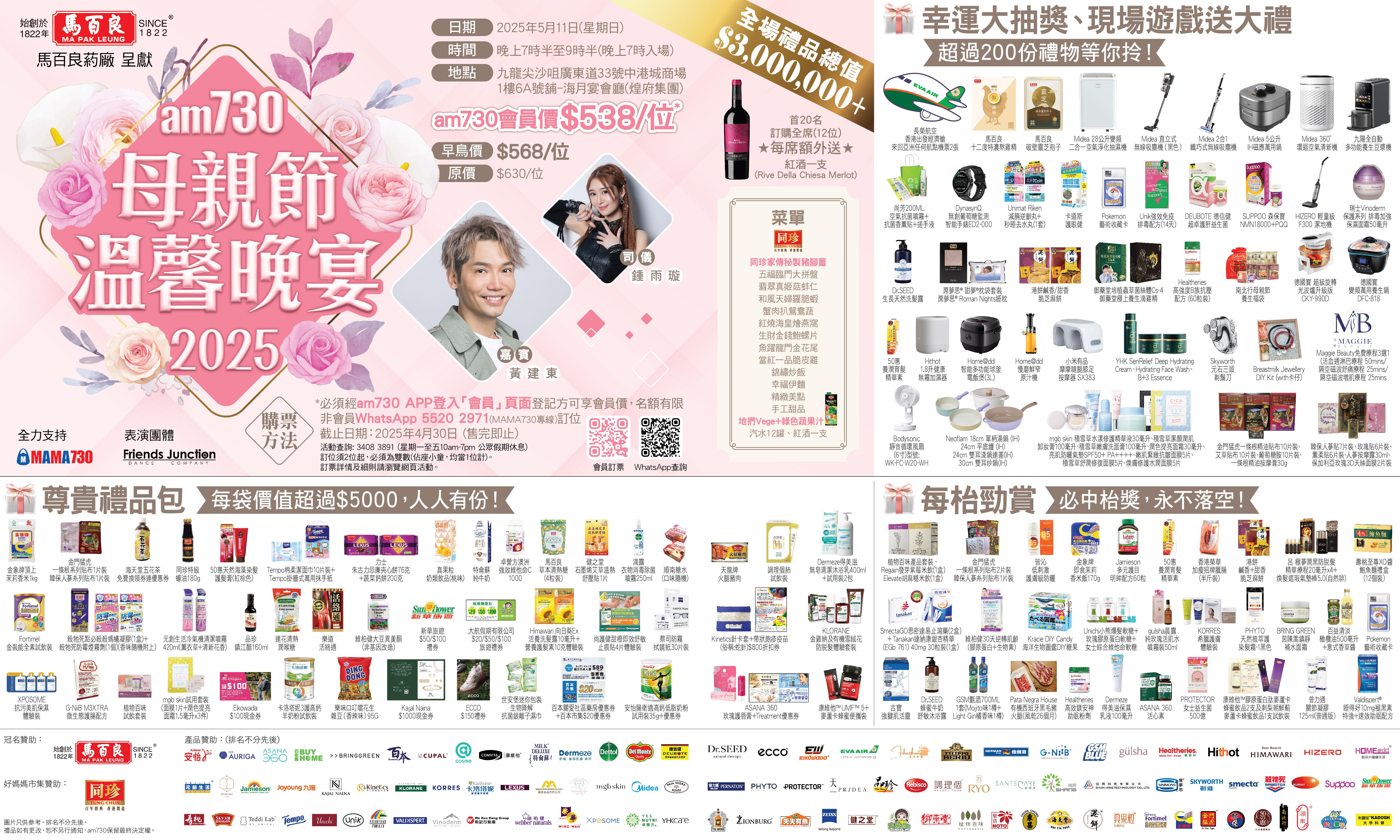 母親節即將來臨,各位孝順仔女準備好如何與媽媽和家人共度這個特別的日子了嗎?由am730主辦的年度盛事【馬百良葯廠呈獻:am730母親節溫馨晚宴2025】將於母親節當晚隆重舉行,除了有美味的中式晚宴外,還有一系列豐富獎品等你拎!今年全場禮品總值超過3百萬元,每位入場人士均可獲贈尊貴禮品包一袋,內含價值超過HK$5,000獎品,亦有開心枱獎,大抽獎等超過200多份禮物等你拎!絕對是您和家人慶祝母親節的最佳選擇!把握早鳥優惠,立即訂位喇!