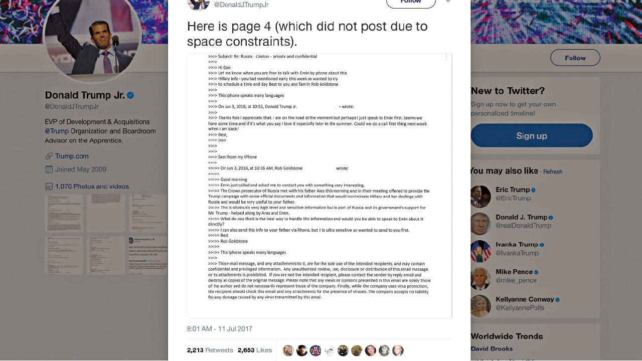 唐納德最初不認在會面前,知悉俄女律師維塞尼茨卡雅掌希拉莉黑材料,以及與俄政府有關,豈料《紐時》在他回應後愈揭愈多會面「內幕」消息,而他在帖文中,首先指出公開自己與牽線的中間人戈德斯通所有來往電郵,是希望大眾知道事件來龍去脈,又說有關會面是一名認識的俄國商人兒子要求,對於他們手上的希拉莉資料,他只當作是對大選參選人的資料搜集。電郵內容與《紐時》之前報道大致相同,提及俄官方文件及資料可證希拉莉與俄國有違法交易,並以此為特朗普助選。