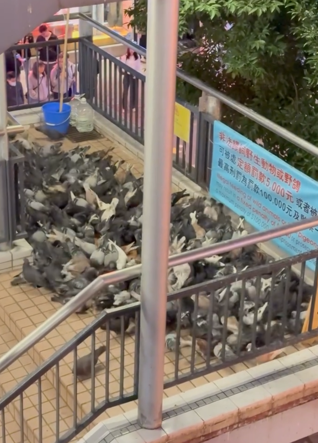 香港野鴿問題影響環境衞生,政府早前修訂《野生動物保護條例》,擴展現行禁止餵飼野生動物範圍至白鴿,惟「野鴿大軍」仍然橫行。近日社交平台流傳影片,可見中環有行人天橋被一群「大軍」攻陷,近百隻白鴿聚集疑是在吃東西,場面震撼。