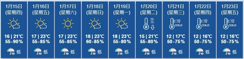 日間大致天晴及乾燥,最高氣溫約21度。稍後局部地區能見度較低。(香港天文台)