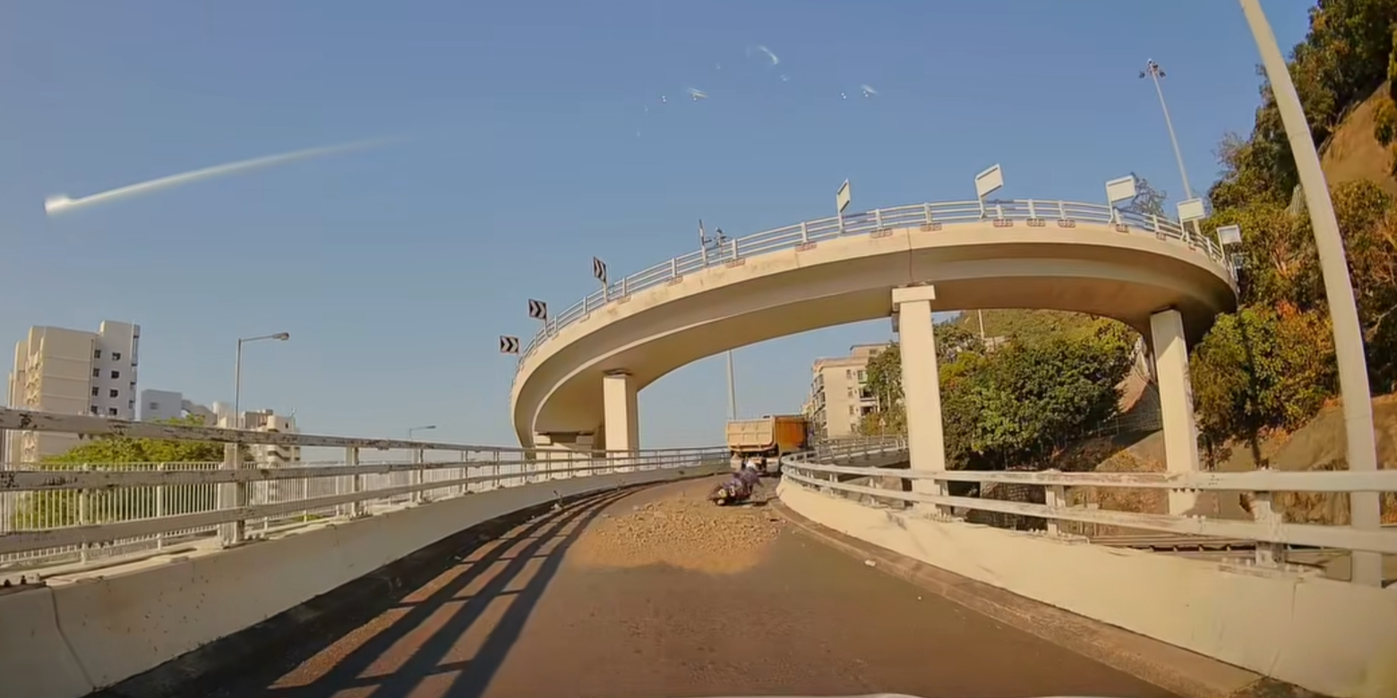 大埔道泥頭車泥石濺瀉鐵騎士倒地,網民笑稱為「Mario賽車」。(車cam L(香港群組)截圖)