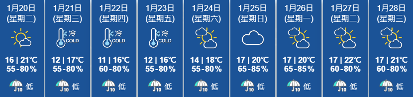 【12:05更新】天文台發出特別天氣提示,一股強烈冬季季候風會在明日(20日)逐漸影響華南,預料本港明日風勢增強,晚上氣溫顯著下降。星期三至星期五大致多雲,天氣持續寒冷,市區最低氣溫在11、12度左右,新界再低兩三度。市民請留意天氣變化,並關顧長者及慢性病患者。