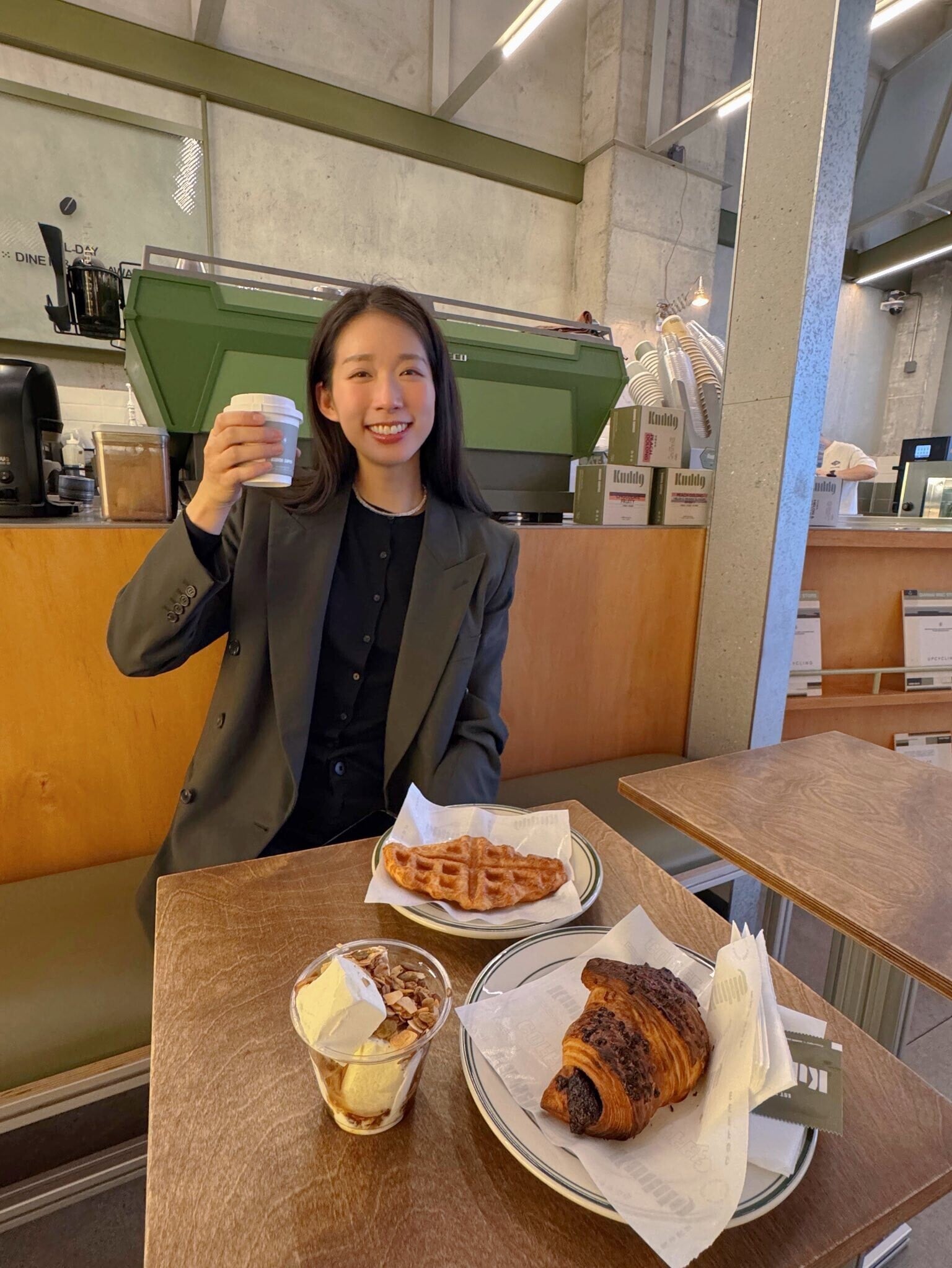 江旻憓參觀前海探索深港合作,興奮「V字手勢」打卡嘆窩夫。(Vivian Kong 江旻憓Facebook)