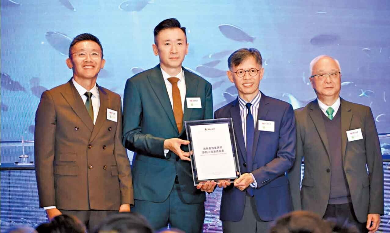 謝展寰(右一)表示,當局正積極發展深海養殖項目,目標在15年內將本地的海魚養殖產量提升10倍。(羅錦鴻攝)
