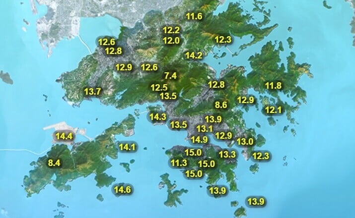 天文台展望未來一兩日大致多雲,天氣持續寒冷,市區最低氣溫在11、12度左右,新界再低兩三度,日間氣溫回升幅度較小。(香港天大台)