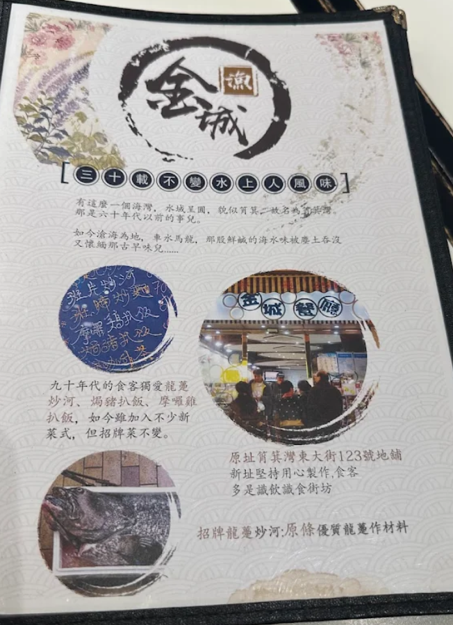 「金城·漁」位於東大街東威大廈地下3號舖,由一對水上人姐妹經營,對水上人的飲食習慣瞭如指掌,一直堅持用新鮮龍躉做食材成賣點,早年以「新鮮龍躉碟頭飯」成鎮店之寶,隨後亦推出龍躉炒河。此外,其嚤囉雞扒飯、焗豬扒飯亦獲不少食客讚賞。店方於社交平台稱結業是艱難的決定,從開業至今留下了許多美好的回憶,「這份情誼我們會永遠銘記在心」,「在結業前的這段時間歡迎大家回來走走,讓我們親口向你說聲謝謝」。