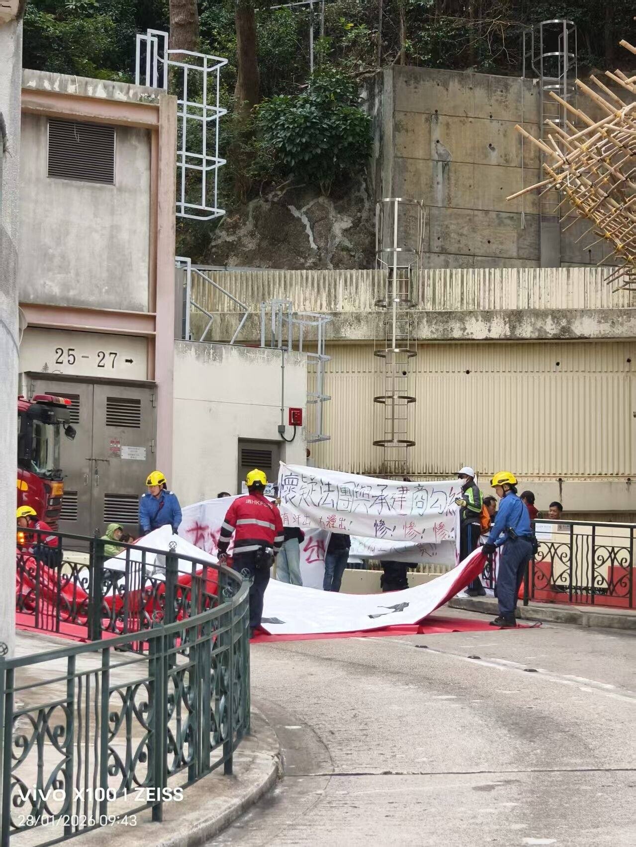 今日(28日)早上8時56分,約20名建築工人於薄扶林域多利道555號碧瑤灣25至27座對開位置追討欠薪,拉起以紅色字寫有「有汗出無糧出」的白布橫額,在場抗議,聲稱被拖欠去年9月至12月份的薪金。其間有工人一度爬上大廈外牆棚架,險象環生。警方及消防員接報到場,消防在大廈外張開氣墊戒備。